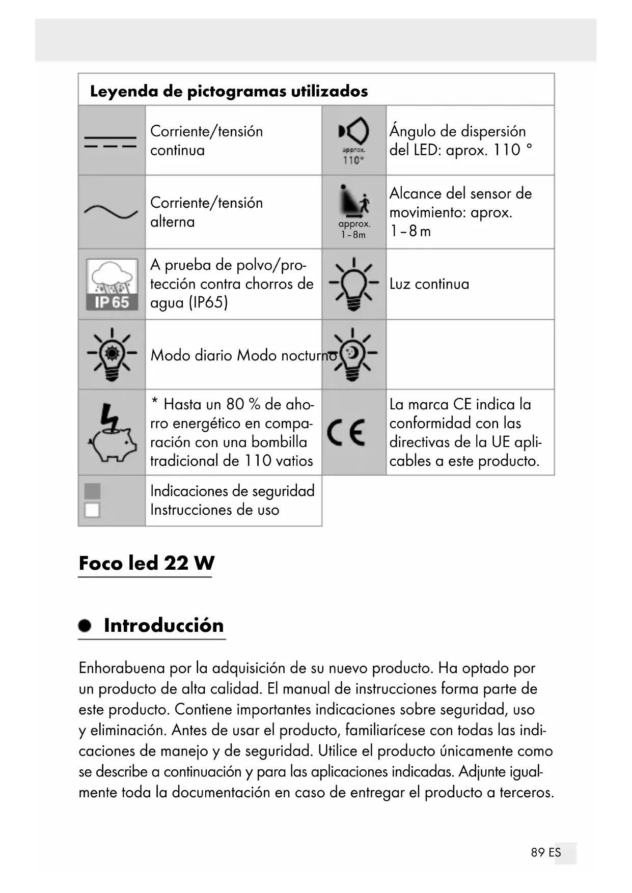 - Hasta un 80 % de aho- rro energético en compa- ración con una bombilla tradicional de 110 vatios La marca CE indica la conformidad con las directivas de la UE apli- cables a este producto. Indicaciones de seguridad Instrucciones de uso Foco led 22 W Introducción Enhorabuena por la adquisición de su nuevo producto. Ha optado por un producto de alta calidad. El manual de instrucciones forma parte de este producto. Contiene importantes indicaciones sobre seguridad, uso y eliminación. Antes de usar el producto, familiarícese con todas las indi- caciones de manejo y de seguridad. Utilice el producto únicamente como se describe a continuación y para las aplicaciones indicadas. Adjunte igual- mente toda la documentación en caso de entregar el producto a terceros.90 ES Uso adecuado Este producto ha sido diseñado únicamente para la iluminación de espa- cios exteriores. El producto está pensado únicamente para uso privado y no para uso comercial ni cualquier otra aplicación. Descripción de los componentes