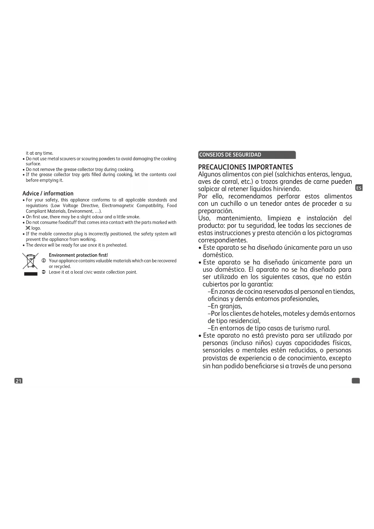- If the grease collector tray gets filled during cooking, let the contents cool before emptying it. Environment protection rst! Your appliance contains valuable materials which can be recovered or recycled. Leave it at a local civic waste collection point. PRECAUCIONES IMPORTANTES Algunos alimentos con piel (salchichas enteras, lengua, aves de corral, etc.) o trozos grandes de carne pueden salpicar al retener líquidos hirviendo. Por ello, recomendamos perforar estos alimentos con un cuchillo o un tenedor antes de proceder a su preparación. Uso, mantenimiento, limpieza e instalación del producto: por tu seguridad, lee todas las secciones de estas instrucciones y presta atención a los pictogramas correspondientes.