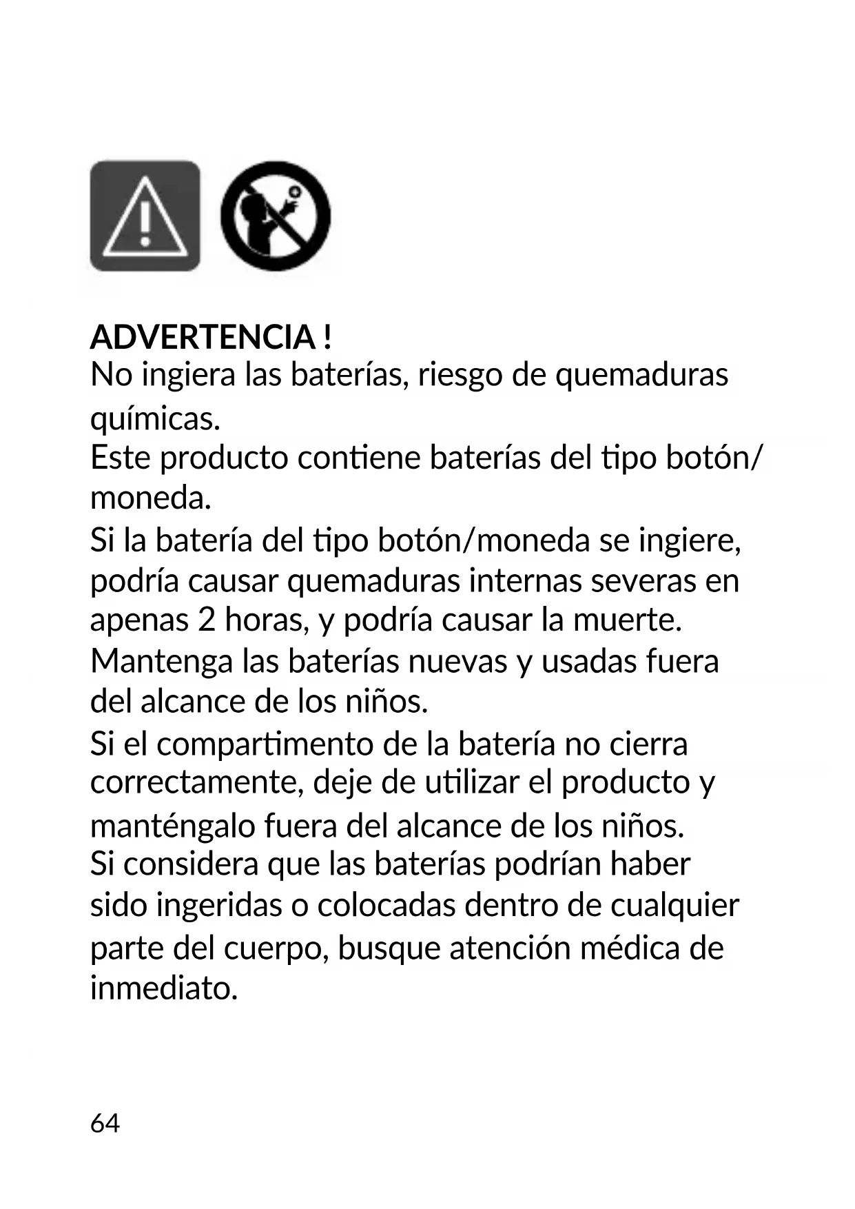 - 5/ Ayuda ADVERTENCIA ! No ingiera las baterías, riesgo de quemaduras químicas. Este producto conene baterías del po botón/ moneda. Si la batería del po botón/moneda se ingiere, podría causar quemaduras internas severas en apenas 2 horas, y podría causar la muerte. Mantenga las baterías nuevas y usadas fuera del alcance de los niños. Si el comparmento de la batería no cierra correctamente, deje de ulizar el producto y manténgalo fuera del alcance de los niños. Si considera que las baterías podrían haber sido ingeridas o colocadas dentro de cualquier parte del cuerpo, busque atención médica de inmediato.ES p. 7364