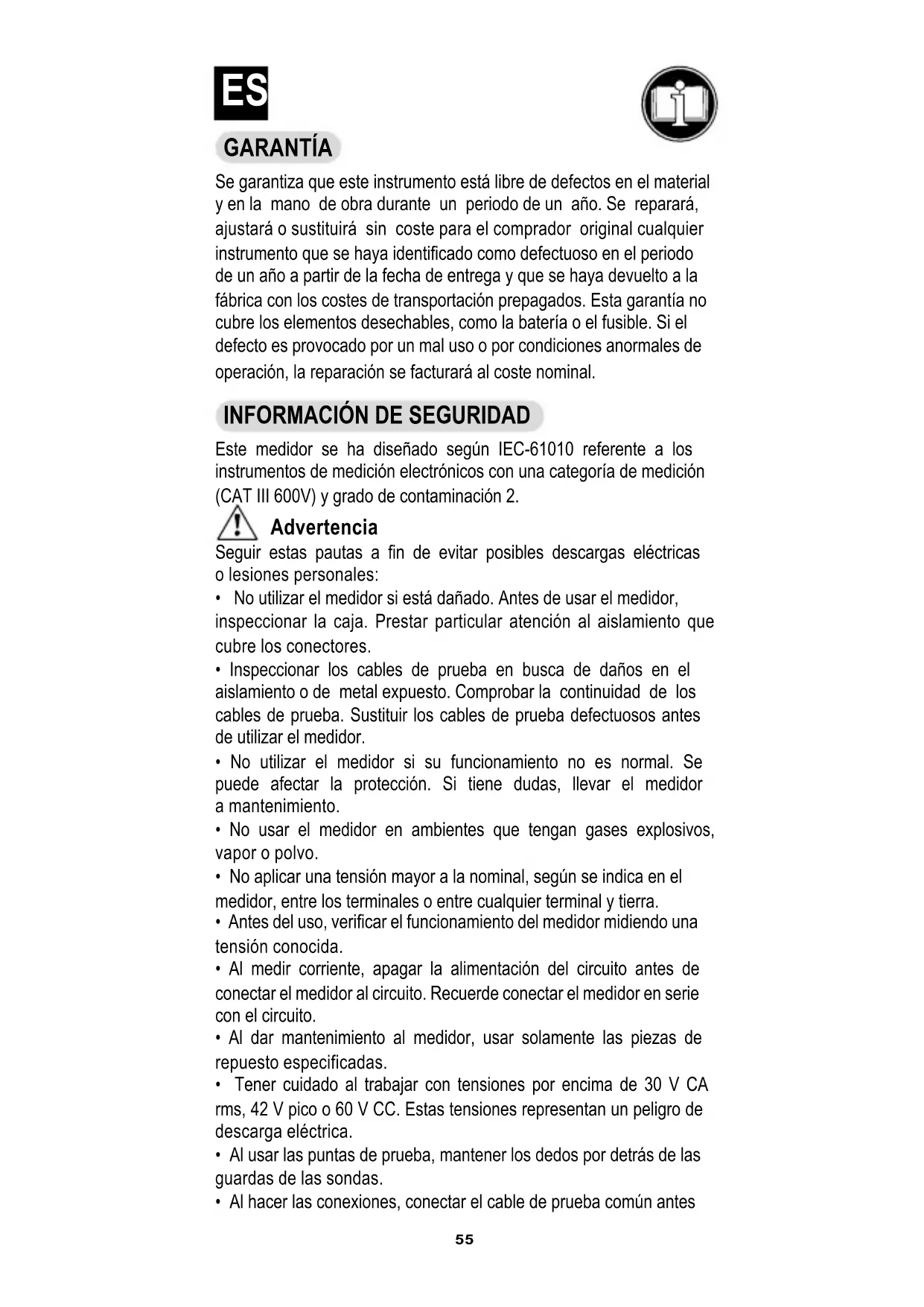 Este medidor se ha diseñado según IEC-61010 referente a los instrumentos de medición electrónicos con una categoría de medición (CAT III 600V) y grado de contaminación 2. Advertencia Seguir estas pautas a fin de evitar posibles descargas eléctricas o lesiones personales: