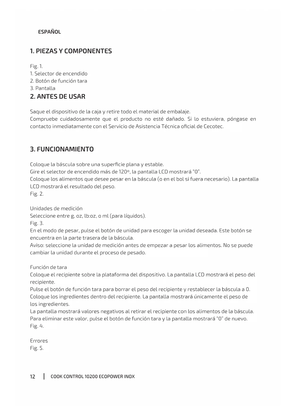 Coloque la báscula sobre una supercie plana y estable. Gire el selector de encendido más de 120º, la pantalla LCD mostrará “0”. Coloque los alimentos que desee pesar en la báscula (o en el bol si fuera necesario). La pantalla LCD mostrará el resultado del peso. Fig. 2. Unidades de medición Seleccione entre g, oz, lb:oz, o ml (para líquidos). Fig. 3. En el modo de pesar, pulse el botón de unidad para escoger la unidad deseada. Este botón se encuentra en la parte trasera de la báscula. Aviso: seleccione la unidad de medición antes de empezar a pesar los alimentos. No se puede cambiar la unidad durante el proceso de pesado. Función de tara Coloque el recipiente sobre la plataforma del dispositivo. La pantalla LCD mostrará el peso del recipiente. Pulse el botón de función tara para borrar el peso del recipiente y restablecer la báscula a 0. Coloque los ingredientes dentro del recipiente. La pantalla mostrará únicamente el peso de los ingredientes. La pantalla mostrará valores negativos al retirar el recipiente con los alimentos de la báscula. Para eliminar este valor, pulse el botón de función tara y la pantalla mostrará “0” de nuevo. Fig. 4. Errores Fig. 5.13 ESPAÑOL