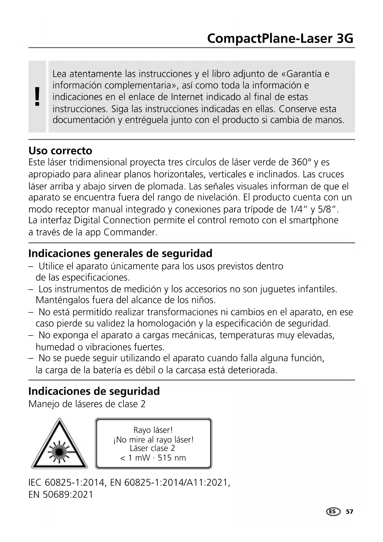 Rayo láser! ¡No mire al rayo láser! Láser clase 2 < 1 mW · 515 nm IEC 60825-1:2014, EN 60825-1:2014/A11:2021, EN 50689:202158 Indicaciones de seguridad Manejo de radiación electromagnética Indicaciones de seguridad Manejo de radiofrecuencias RF – El instrumento de medición cumple las normas y limitaciones de compati- bilidad electromagnética según la Directiva europea 2014/30/UE de CEM, cubierta por la Directiva 2014/53/UE de equipos radioeléctricos (RED). – Es necesario observar las limitaciones de uso locales, por ejemplo en hospitales, aviones, gasolineras o cerca de personas con marcapasos. Se pueden producir efectos peligrosos o interferencias sobre los dispositivos electrónicos o por causa de estos. – El uso cerca de altas tensiones o bajo campos electromagnéticos alternos elevados puede mermar la precisión de la medición. – El instrumento de medición está equipado con una interfaz radioeléctrica. – El instrumento de medición cumple las normas y limitaciones de compatibilidad electromagnética y emisión radioeléctrica según la Directiva 2014/53/UE de RED. – Umarex GmbH & Co. KG declara aquí que el tipo de equipo radioeléctrico CompactPlane-Laser 3G cumple los requisitos básicos y otras disposiciones de la Directiva 2014/53/UE de equipos radioeléctricos (RED). El texto completo de la declaración de conformidad UE está disponible en la siguiente dirección de Internet: https://packd.li/ll/anb/in – Atención: No mire directamente el rayo ni su reejo. – No oriente el rayo láser hacia las personas. – Si el rayo láser de clase 2 se proyecta en los ojos, ciérrelos inmediatamente y aparte la cabeza de su trayectoria. – No mire nunca el rayo láser o las reexiones con aparatos ópticos (lupa, microscopio, prismáticos, ...). – No utilice el láser a la altura de los ojos (1,40…1,90 m). – Durante el uso de un equipo láser hay que cubrir necesariamente todas las supercies reectantes, especulares o brillantes. – En zonas de tráco públicas debe limitarse el recorrido de los rayos dentro de lo posible mediante barreras o tabiques móviles y marcar la zona de trabajo con láser con placas de advertencia. ESCompactPlane-Laser 3G