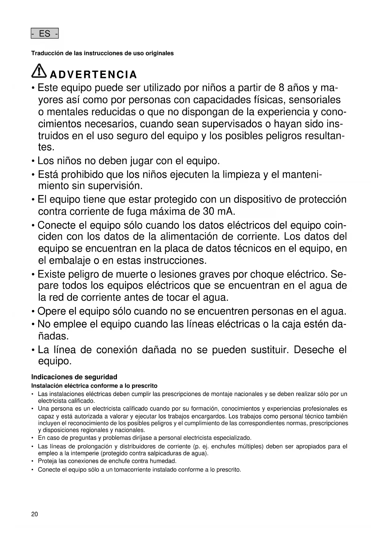 - La línea de conexión dañada no se pueden sustituir. Deseche el equipo. Indicaciones de seguridad Instalación eléctrica conforme a lo prescrito