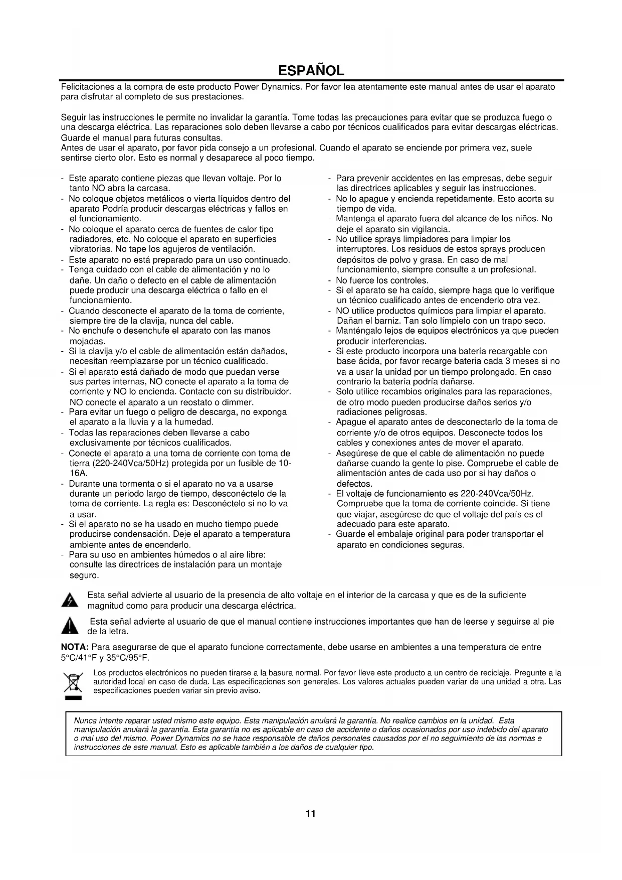 Nunca intente reparar usted mismo este equipo. Esta manipulación anulará la garantía. No realice cambios en la unidad. Esta manipulación anulará la garantía. Esta garantía no es aplicable en caso de accidente o daños ocasionados por uso indebido del aparato o mal uso del mismo. Power Dynamics no se hace responsable de daños personales causados por el no seguimiento de las normas e instrucciones de este manual. Esto es aplicable también a los daños de cualquier tipo.12