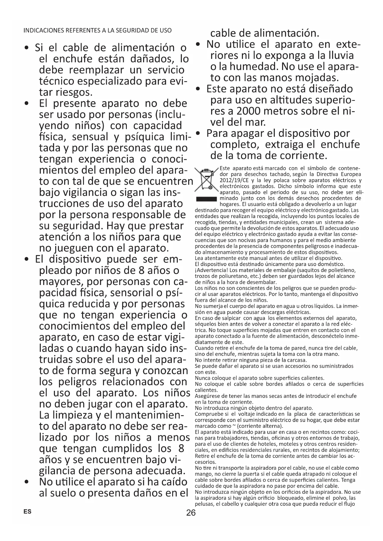 - Para apagar el disposivo por completo, extraiga el enchufe de la toma de corriente. Este aparato está marcado con el símbolo de contene- dor para desechos tachado, según la Direcva Europea 2012/19/CE y la ley polaca sobre aparatos eléctricos y electrónicos gastados. Dicho símbolo informa que este aparato, pasado el periodo de su uso, no debe ser eli- minado junto con los demás desechos procedentes de hogares. El usuario está obligado a devolverlo a un lugar desnado para recoger el equipo eléctrico y electrónico gastado. Las endades que realizan la recogida, incluyendo los puntos locales de recogida, endas, y endades municipales, crean un sistema ade- cuado que permite la devolución de estos aparatos. El adecuado uso del equipo eléctrico y electrónico gastado ayuda a evitar las conse- cuencias que son nocivas para humanos y para el medio ambiente procedentes de la presencia de componentes peligrosos e inadecua- do almacenamiento y procesamiento de estos disposivos. Lea atentamente este manual antes de ulizar el disposivo. El disposivo está desnado únicamente para uso domésco. ¡Advertencia! Los materiales de embalaje (saquitos de polieleno, trozos de poliuretano, etc.) deben ser guardados lejos del alcance de niños a la hora de desembalar. Los niños no son conscientes de los peligros que se pueden produ- cir al usar aparatos eléctricos. Por lo tanto, mantenga el disposivo fuera del alcance de los niños. No sumerja el cuerpo del aparato en agua u otros líquidos. La inmer- sión en agua puede causar descargas eléctricas. En caso de salpicar con agua los elementos externos del aparato, séquelos bien antes de volver a conectar el aparato a la red eléc- trica. No toque supercies mojadas que entren en contacto con el aparato conectado a la fuente de alimentación, desconéctelo inme- diatamente de este. Cuando rere el enchufe de la toma de pared, nunca re del cable, sino del enchufe, mientras sujeta la toma con la otra mano. No intente rerar ninguna pieza de la carcasa. Se puede dañar el aparato si se usan accesorios no suministrados con este. Nunca coloque el aparato sobre supercies calientes. No coloque el cable sobre bordes alados o cerca de supercies calientes. Asegúrese de tener las manos secas antes de introducir el enchufe en la toma de corriente. No introduzca ningún objeto dentro del aparato. Compruebe si el voltaje indicado en la placa de caracteríscas se corresponde con el suministro eléctrico de su hogar, que debe estar marcado como ~ (corriente alterna). El aparato está indicado para usar en casa o en recintos como: coci- nas para trabajadores, endas, ocinas y otros entornos de trabajo, para el uso de clientes de hoteles, moteles y otros centros residen- ciales, en edicios residenciales rurales, en recintos de alojamiento; Rere el enchufe de la toma de corriente antes de cambiar los ac- cesorios. No re ni transporte la aspiradora por el cable, no use el cable como mango, no cierre la puerta si el cable queda atrapado ni coloque el cable sobre bordes alados o cerca de supercies calientes. Tenga cuidado de que la aspiradora no pase por encima del cable. No introduzca ningún objeto en los oricios de la aspiradora. No use la aspiradora si hay algún oricio bloqueado, elimine el polvo, las pelusas, el cabello y cualquier otra cosa que pueda reducir el ujo ES27