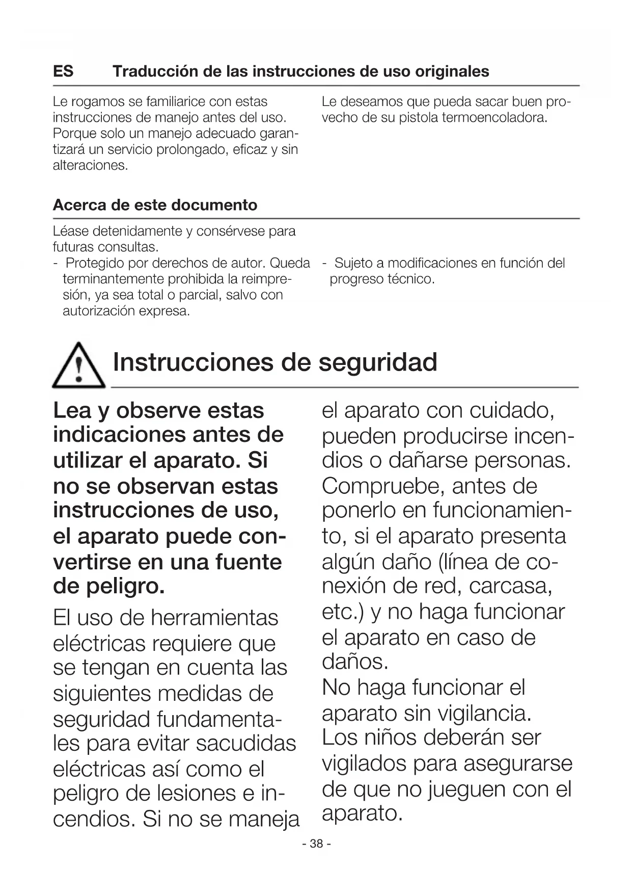 ANNI DEL PRODUTTORE- 38 - Lea y observe estas indicaciones antes de utilizar el aparato. Si no se observan estas instrucciones de uso, el aparato puede con- vertirse en una fuente de peligro. El uso de herramientas eléctricas requiere que se tengan en cuenta las siguientes medidas de seguridad fundamenta- les para evitar sacudidas eléctricas así como el peligro de lesiones e in- cendios. Si no se maneja el aparato con cuidado, pueden producirse incen- dios o dañarse personas. Compruebe, antes de ponerlo en funcionamien- to, si el aparato presenta algún daño (línea de co- nexión de red, carcasa, etc.) y no haga funcionar el aparato en caso de daños. No haga funcionar el aparato sin vigilancia. Los niños deberán ser vigilados para asegurarse de que no jueguen con el aparato. Le rogamos se familiarice con estas instrucciones de manejo antes del uso. Porque solo un manejo adecuado garan- tizará un servicio prolongado, eficaz y sin alteraciones. Le deseamos que pueda sacar buen pro- vecho de su pistola termoencoladora. Traducción de las instrucciones de uso originales Acerca de este documento Léase detenidamente y consérvese para futuras consultas. - Protegido por derechos de autor. Queda terminantemente prohibida la reimpre- sión, ya sea total o parcial, salvo con autorización expresa. - Sujeto a modificaciones en función del progreso técnico. Instrucciones de seguridad ES- 39 -