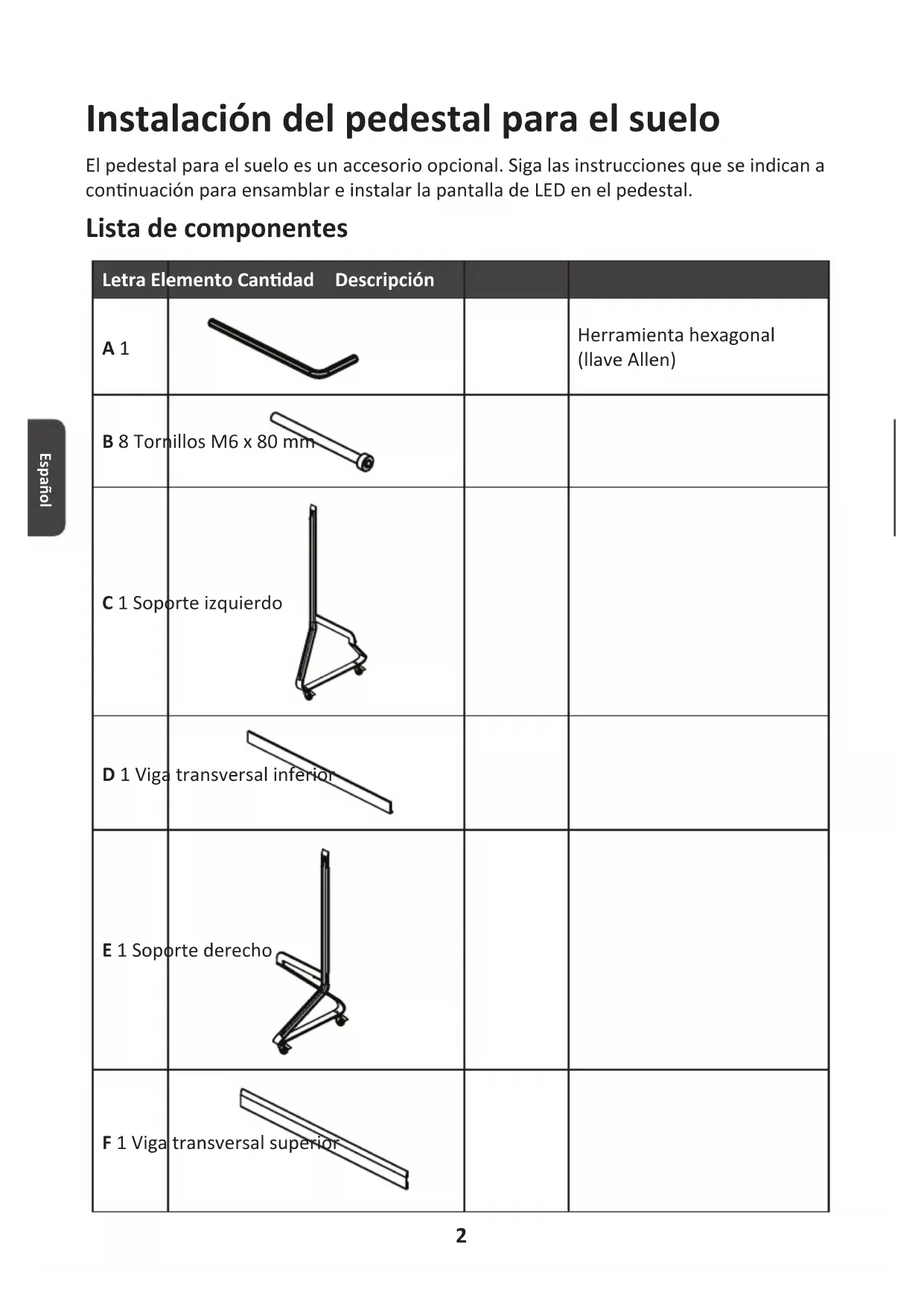 HDMI OUT USBUSBUSBRS2322 Español Instalación del pedestal para el suelo El pedestal para el suelo es un accesorio opcional. Siga las instrucciones que se indican a connuación para ensamblar e instalar la pantalla de LED en el pedestal. Lista de componentes Letra Elemento Candad Descripción A 1 Herramienta hexagonal (llave Allen) B 8 Tornillos M6 x 80 mm C 1 Soporte izquierdo D 1 Viga transversal inferior E 1 Soporte derecho F 1 Viga transversal superior3 Español 2233.3 mm
