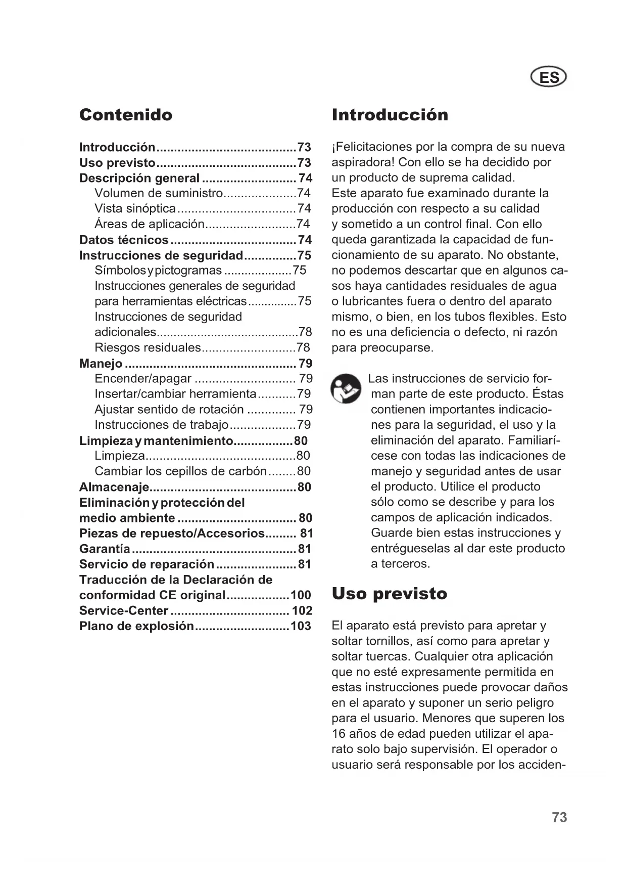 - Introducción ¡Felicitaciones por la compra de su nueva aspiradora! Con ello se ha decidido por un producto de suprema calidad. Este aparato fue examinado durante la producción con respecto a su calidad y sometido a un control nal. Con ello queda garantizada la capacidad de fun- cionamiento de su aparato. No obstante, no podemos descartar que en algunos ca- sos haya cantidades residuales de agua o lubricantes fuera o dentro del aparato mismo, o bien, en los tubos exibles. Esto no es una deciencia o defecto, ni razón para preocuparse. Las instrucciones de servicio for- man parte de este producto. Éstas contienen importantes indicacio- nes para la seguridad, el uso y la eliminación del aparato. Familiarí- cese con todas las indicaciones de manejo y seguridad antes de usar el producto. Utilice el producto sólo como se describe y para los campos de aplicación indicados. Guarde bien estas instrucciones y entrégueselas al dar este producto a terceros. Uso previsto El aparato está previsto para apretar y soltar tornillos, así como para apretar y soltar tuercas. Cualquier otra aplicación que no esté expresamente permitida en estas instrucciones puede provocar daños en el aparato y suponer un serio peligro para el usuario. Menores que superen los 16 años de edad pueden utilizar el apa- rato solo bajo supervisión. El operador o usuario será responsable por los acciden- Traducción de la Declaración de conformidad CE original p. 100