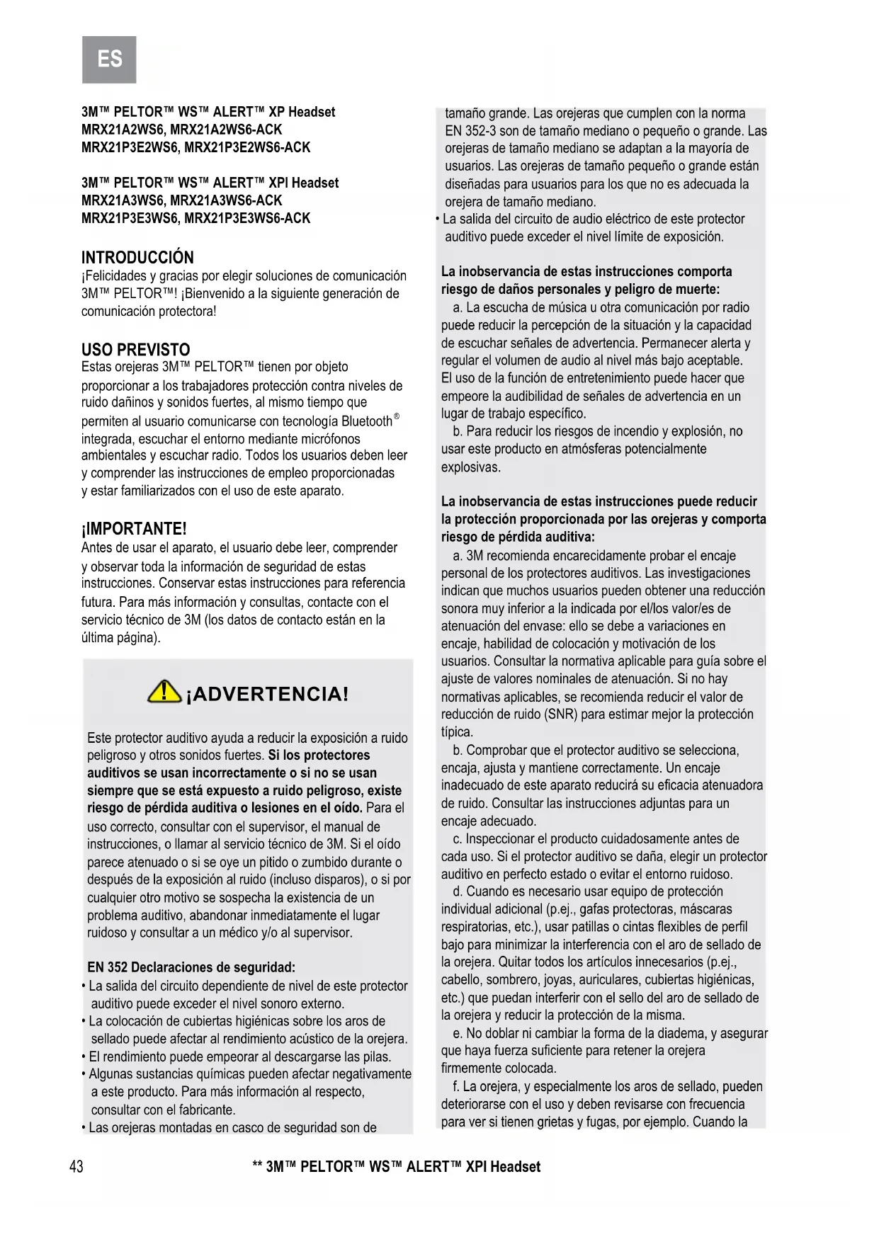 ¡ADVERTENCIA! Este protector auditivo ayuda a reducir la exposición a ruido peligroso y otros sonidos fuertes. Si los protectores auditivos se usan incorrectamente o si no se usan siempre que se está expuesto a ruido peligroso, existe riesgo de pérdida auditiva o lesiones en el oído. Para el uso correcto, consultar con el supervisor, el manual de instrucciones, o llamar al servicio técnico de 3M. Si el oído parece atenuado o si se oye un pitido o zumbido durante o después de la exposición al ruido (incluso disparos), o si por cualquier otro motivo se sospecha la existencia de un problema auditivo, abandonar inmediatamente el lugar ruidoso y consultar a un médico y/o al supervisor.EN 352 Declaraciones de seguridad:• La salida del circuito dependiente de nivel de este protector auditivo puede exceder el nivel sonoro externo.• La colocación de cubiertas higiénicas sobre los aros de sellado puede afectar al rendimiento acústico de la orejera.• El rendimiento puede empeorar al descargarse las pilas. • Algunas sustancias químicas pueden afectar negativamente a este producto. Para más información al respecto, consultar con el fabricante.• Las orejeras montadas en casco de seguridad son de tamaño grande. Las orejeras que cumplen con la norma EN 352-3 son de tamaño mediano o pequeño o grande. Las orejeras de tamaño mediano se adaptan a la mayoría de usuarios. Las orejeras de tamaño pequeño o grande están diseñadas para usuarios para los que no es adecuada la orejera de tamaño mediano.• La salida del circuito de audio eléctrico de este protector auditivo puede exceder el nivel límite de exposición.La inobservancia de estas instrucciones comporta riesgo de daños personales y peligro de muerte:a. La escucha de música u otra comunicación por radio puede reducir la percepción de la situación y la capacidad de escuchar señales de advertencia. Permanecer alerta y regular el volumen de audio al nivel más bajo aceptable. El uso de la función de entretenimiento puede hacer que empeore la audibilidad de señales de advertencia en un lugar de trabajo especíco.b. Para reducir los riesgos de incendio y explosión, no usar este producto en atmósferas potencialmente explosivas.La inobservancia de estas instrucciones puede reducir la protección proporcionada por las orejeras y comporta riesgo de pérdida auditiva:a. 3M recomienda encarecidamente probar el encaje personal de los protectores auditivos. Las investigaciones indican que muchos usuarios pueden obtener una reducción sonora muy inferior a la indicada por el/los valor/es de atenuación del envase: ello se debe a variaciones en encaje, habilidad de colocación y motivación de los usuarios. Consultar la normativa aplicable para guía sobre el ajuste de valores nominales de atenuación. Si no hay normativas aplicables, se recomienda reducir el valor de reducción de ruido (SNR) para estimar mejor la protección típica.b. Comprobar que el protector auditivo se selecciona, encaja, ajusta y mantiene correctamente. Un encaje inadecuado de este aparato reducirá su ecacia atenuadora de ruido. Consultar las instrucciones adjuntas para un encaje adecuado.c. Inspeccionar el producto cuidadosamente antes de cada uso. Si el protector auditivo se daña, elegir un protector auditivo en perfecto estado o evitar el entorno ruidoso.d. Cuando es necesario usar equipo de protección individual adicional (p.ej., gafas protectoras, máscaras respiratorias, etc.), usar patillas o cintas exibles de perl bajo para minimizar la interferencia con el aro de sellado de la orejera. Quitar todos los artículos innecesarios (p.ej., cabello, sombrero, joyas, auriculares, cubiertas higiénicas, etc.) que puedan interferir con el sello del aro de sellado de la orejera y reducir la protección de la misma.e. No doblar ni cambiar la forma de la diadema, y asegurar que haya fuerza suciente para retener la orejera rmemente colocada.f. La orejera, y especialmente los aros de sellado, pueden deteriorarse con el uso y deben revisarse con frecuencia para ver si tienen grietas y fugas, por ejemplo. Cuando la
