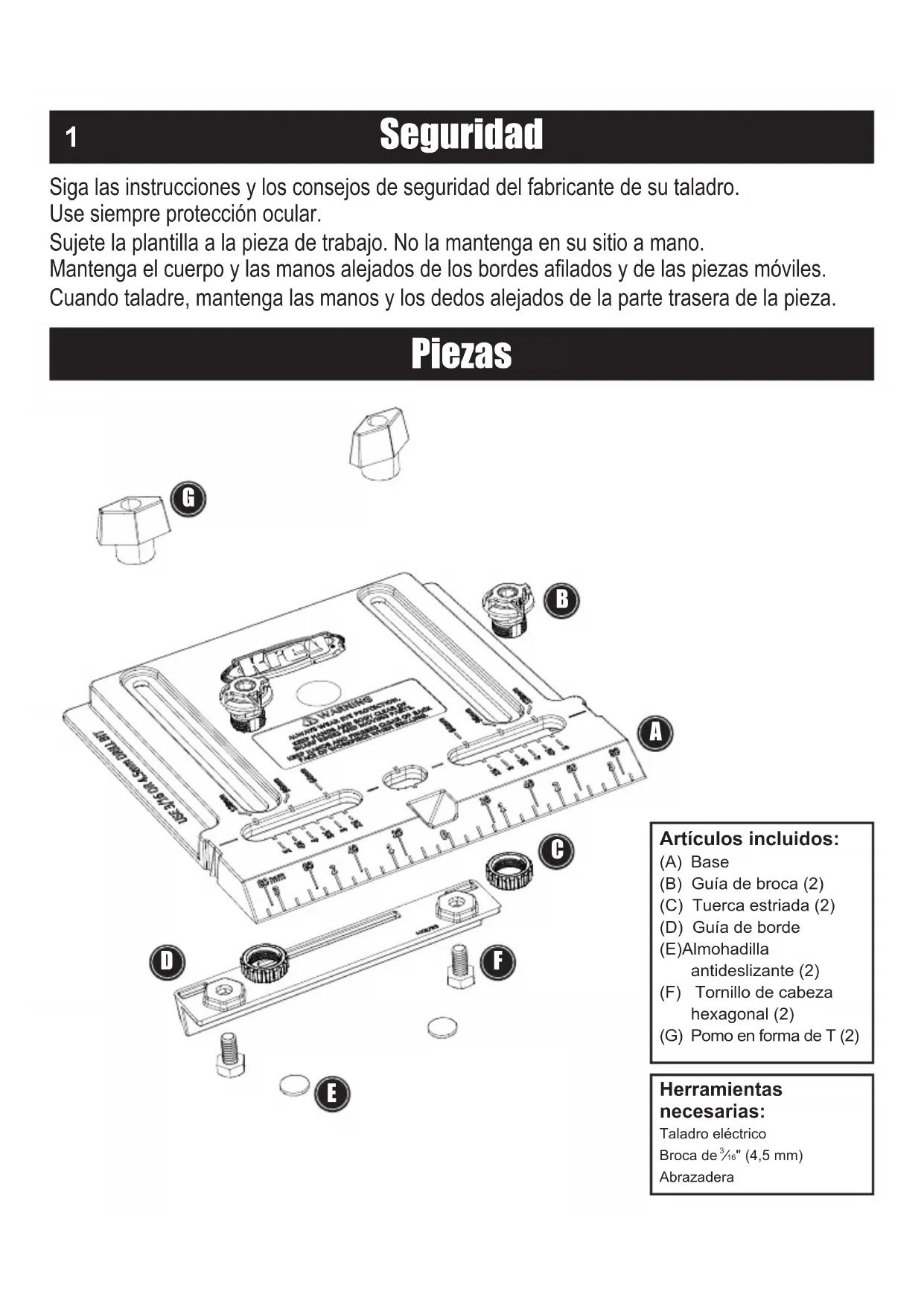 Artículos incluidos: (A) Base(B) Guía de broca (2)(C) Tuerca estriada (2)(D) Guía de borde(E) Almohadilla antideslizante (2)(F) Tornillo de cabeza hexagonal (2)(G) Pomo en forma de T (2) Herramientas necesarias: Taladro eléctricoBroca de ⁄16" (4,5 mm)AbrazaderaMontaje