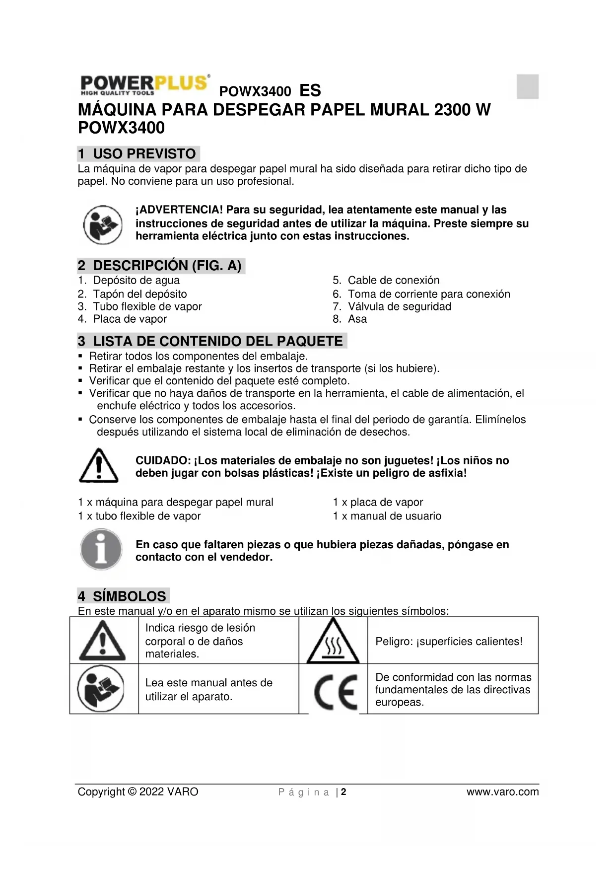 Copyright © 2022 VARO P á g i n a | 2 www.varo.com MÁQUINA PARA DESPEGAR PAPEL MURAL 2300 W POWX3400 1 USO PREVISTO La máquina de vapor para despegar papel mural ha sido diseñada para retirar dicho tipo de papel. No conviene para un uso profesional. ¡ADVERTENCIA! Para su seguridad, lea atentamente este manual y las instrucciones de seguridad antes de utilizar la máquina. Preste siempre su herramienta eléctrica junto con estas instrucciones. 2 DESCRIPCIÓN (FIG. A)