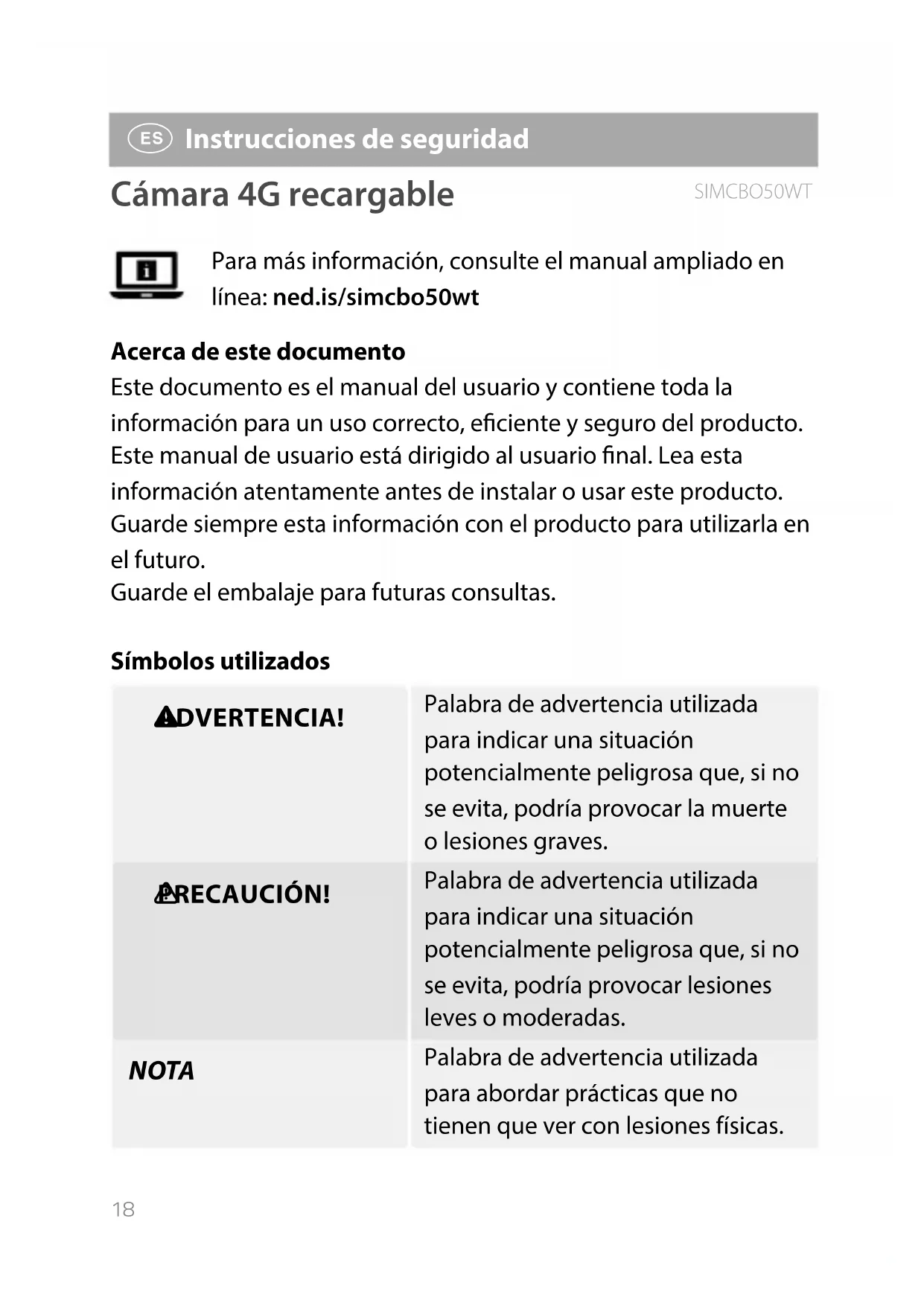 Instrucciones de seguridad Cámara 4G recargable SIMCBO50WT Para más información, consulte el manual ampliado en línea: ned.is/simcbo50wt Acerca de este documento Este documento es el manual del usuario y contiene toda la información para un uso correcto, eciente y seguro del producto. Este manual de usuario está dirigido al usuario nal. Lea esta información atentamente antes de instalar o usar este producto. Guarde siempre esta información con el producto para utilizarla en el futuro. Guarde el embalaje para futuras consultas. Símbolos utilizados ADVERTENCIA! Palabra de advertencia utilizada para indicar una situación potencialmente peligrosa que, si no se evita, podría provocar la muerte o lesiones graves. PRECAUCIÓN! Palabra de advertencia utilizada para indicar una situación potencialmente peligrosa que, si no se evita, podría provocar lesiones leves o moderadas. NOTA Palabra de advertencia utilizada para abordar prácticas que no tienen que ver con lesiones físicas.19Nedis® SmartLife | Safety instructions Uso previsto por el fabricante Este producto está diseñado como cámara para exteriores para ver, oír y hablar con los visitantes que están fuera mediante la aplicación SmartLife de su teléfono móvil. Utilice el producto únicamente tal como se describe en este manual de usuario. Instrucciones de seguridad