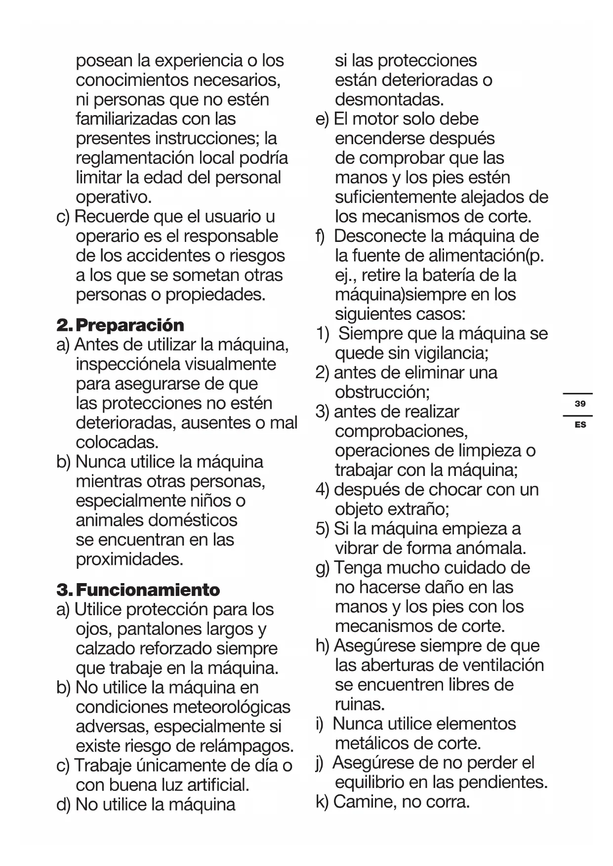 l) No intente llegar más lejos de lo posible y mantenga el equilibrio en todo momento. m)No toque ninguna pieza móvil que constituya un peligro hasta que la máquina se haya desconectado de la red eléctrica y todas las piezas móviles estén completamente quietas.