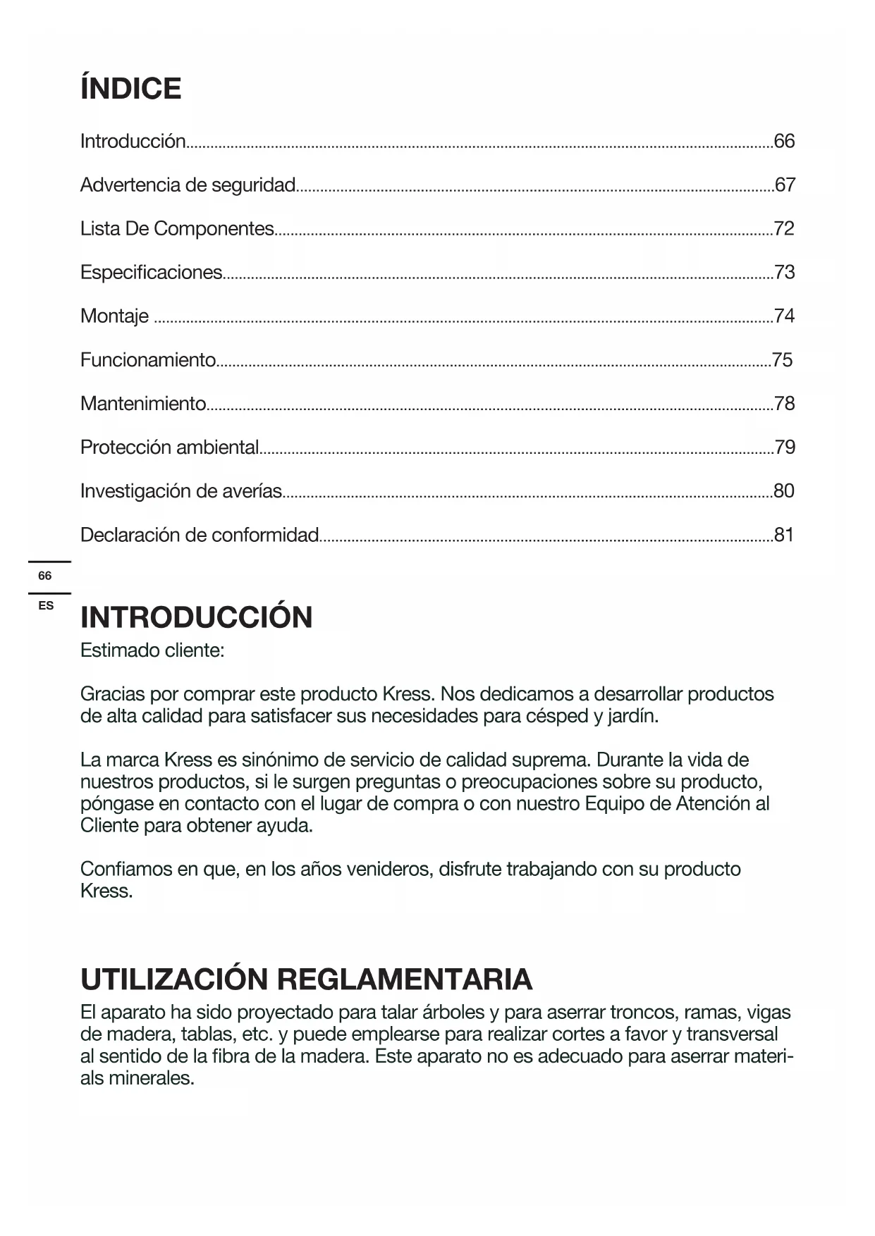 El aparato ha sido proyectado para talar árboles y para aserrar troncos, ramas, vigas de madera, tablas, etc. y puede emplearse para realizar cortes a favor y transversal al sentido de la bra de la madera. Este aparato no es adecuado para aserrar materi- als minerales.67