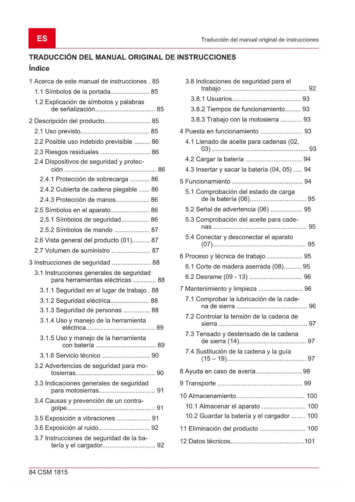 Podar ramas finas Gracias al accionamiento eléctrico, la sierra de poda con batería no solo puede utilizarse al aire libre, sino que también se puede emplear para serrar madera en espacios cerrados. Cualquier otro uso distinto del aquí descrito se considera no conforme a lo previsto. No está prevista para talar árboles. Este aparato ha sido diseñado únicamente para su uso privado. Cualquier otro uso distinto, así como cualquier modificación o ampliación no per- mitida, se considera un uso indebido y tiene co- mo consecuencia la extinción de la garantía y la pérdida de la conformidad, así como el rechazo de toda responsabilidad por parte del fabricante por daños del usuario o de terceros.ES 86 CSM 1815 Descripción del producto ¡PRECAUCIÓN! Peligro de lesiones por un uso no adecuado del aparato. Si corta ma- dera con la motosierra y la madera presenta cuerpos extraños u otros materiales, podrían pro- ducirse lesiones como consecuencia.