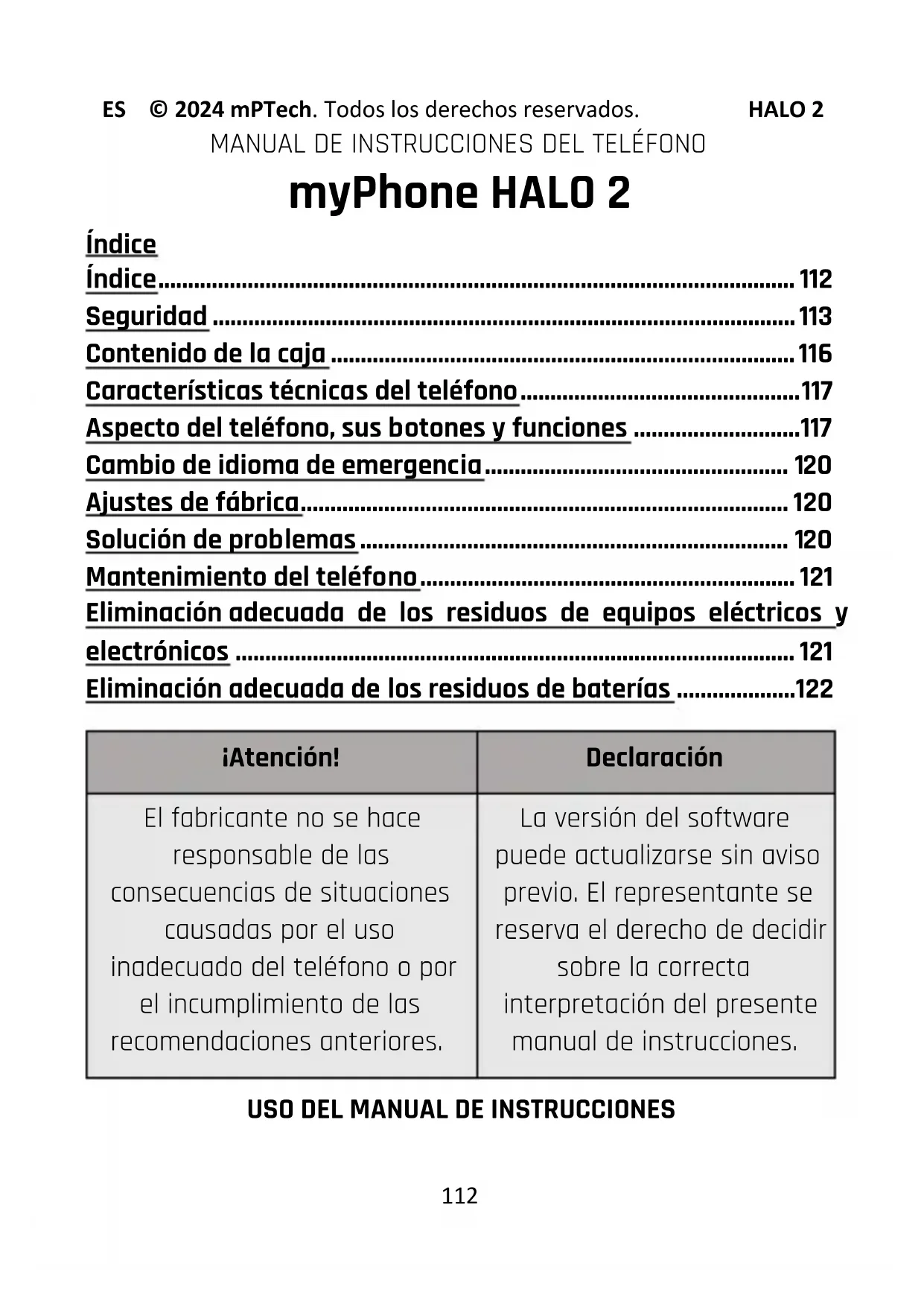 - Eliminación adecuada de los residuos de baterías ¡Atención! Declaración El fabricante no se hace responsable de las consecuencias de situaciones causadas por el uso inadecuado del teléfono o por el incumplimiento de las recomendaciones anteriores. La versión del software puede actualizarse sin aviso previo. El representante se reserva el derecho de decidir sobre la correcta interpretación del presente manual de instrucciones. p. 122