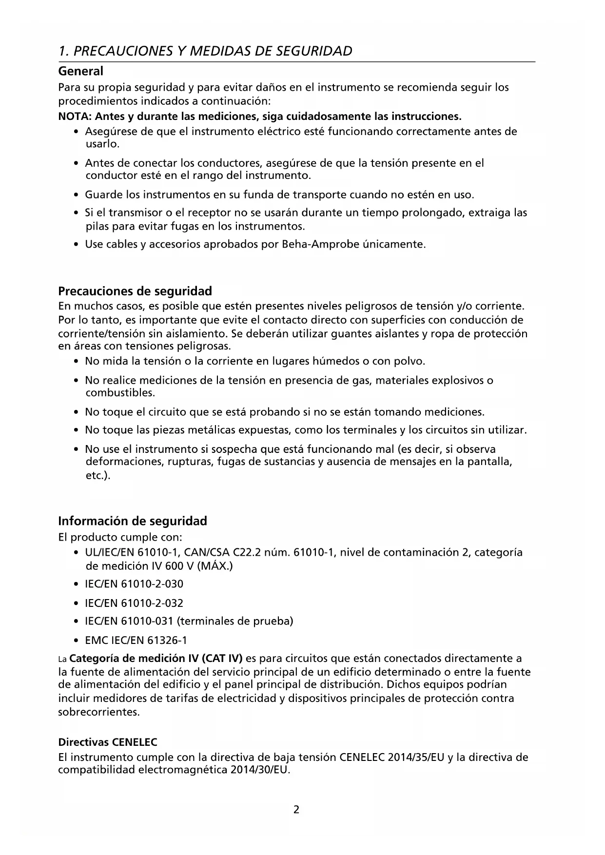 - Use cables y accesorios aprobados por Beha-Amprobe únicamente. Precauciones de seguridad En muchos casos, es posible que estén presentes niveles peligrosos de tensión y/o corriente. Por lo tanto, es importante que evite el contacto directo con superficies con conducción de corriente/tensión sin aislamiento. Se deberán utilizar guantes aislantes y ropa de protección en áreas con tensiones peligrosas.