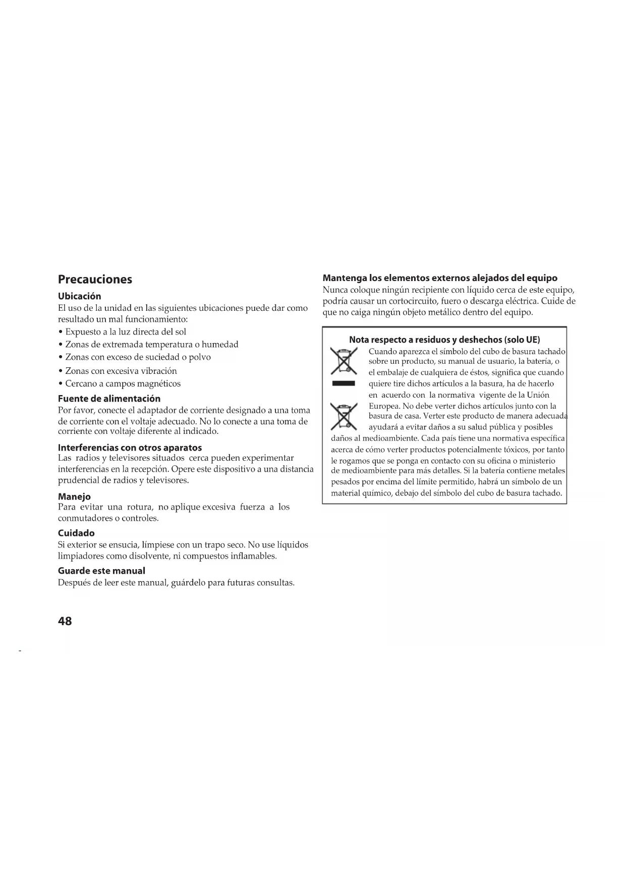 - Cercano a campos magnéticos Fuente de alimentación Por favor, conecte el adaptador de corriente designado a una toma de corriente con el voltaje adecuado. No lo conecte a una toma de corriente con voltaje diferente al indicado. Interferencias con otros aparatos Las radios y televisores situados cerca pueden experimentar interferencias en la recepción. Opere este dispositivo a una distancia prudencial de radios y televisores. Manejo Para evitar una rotura, no aplique excesiva fuerza a los conmutadores o controles. Cuidado Si exterior se ensucia, límpiese con un trapo seco. No use líquidos limpiadores como disolvente, ni compuestos inamables. Guarde este manual Después de leer este manual, guárdelo para futuras consultas. Mantenga los elementos externos alejados del equipo Nunca coloque ningún recipiente con líquido cerca de este equipo, podría causar un cortocircuito, fuero o descarga eléctrica. Cuide de que no caiga ningún objeto metálico dentro del equipo. Nota respecto a residuos y deshechos (solo UE) Cuando aparezca el símbolo del cubo de basura tachado sobre un producto, su manual de usuario, la batería, o el embalaje de cualquiera de éstos, signica que cuando quiere tire dichos artículos a la basura, ha de hacerlo en acuerdo con la normativa vigente de la Unión Europea. No debe verter dichos artículos junto con la basura de casa. Verter este producto de manera adecuada ayudará a evitar daños a su salud pública y posibles daños al medioambiente. Cada país tiene una normativa especíca acerca de cómo verter productos potencialmente tóxicos, por tanto le rogamos que se ponga en contacto con su ocina o ministerio de medioambiente para más detalles. Si la batería contiene metales pesados por encima del límite permitido, habrá un símbolo de un material químico, debajo del símbolo del cubo de basura tachado.49