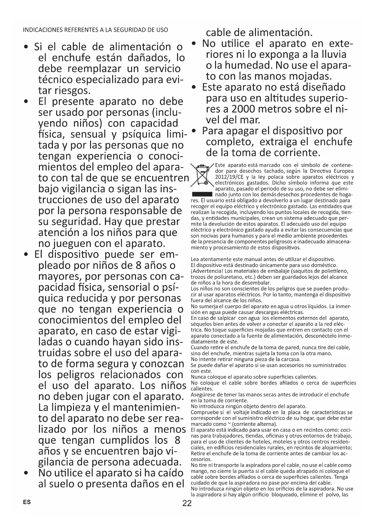 - Para apagar el disposivo por completo, extraiga el enchufe de la toma de corriente. Este aparato está marcado con el símbolo de contene- dor para desechos tachado, según la Direcva Europea 2012/19/CE y la ley polaca sobre aparatos eléctricos y electrónicos gastados. Dicho símbolo informa que este aparato, pasado el periodo de su uso, no debe ser elimi- nado junto con los demás desechos procedentes de hoga- res. El usuario está obligado a devolverlo a un lugar desnado para recoger el equipo eléctrico y electrónico gastado. Las endades que realizan la recogida, incluyendo los puntos locales de recogida, en- das, y endades municipales, crean un sistema adecuado que per- mite la devolución de estos aparatos. El adecuado uso del equipo eléctrico y electrónico gastado ayuda a evitar las consecuencias que son nocivas para humanos y para el medio ambiente procedentes de la presencia de componentes peligrosos e inadecuado almacena- miento y procesamiento de estos disposivos. Lea atentamente este manual antes de ulizar el disposivo. El disposivo está desnado únicamente para uso domésco. ¡Advertencia! Los materiales de embalaje (saquitos de polieleno, trozos de poliuretano, etc.) deben ser guardados lejos del alcance de niños a la hora de desembalar. Los niños no son conscientes de los peligros que se pueden produ- cir al usar aparatos eléctricos. Por lo tanto, mantenga el disposivo fuera del alcance de los niños. No sumerja el cuerpo del aparato en agua u otros líquidos. La inmer- sión en agua puede causar descargas eléctricas. En caso de salpicar con agua los elementos externos del aparato, séquelos bien antes de volver a conectar el aparato a la red eléc- trica. No toque supercies mojadas que entren en contacto con el aparato conectado a la fuente de alimentación, desconéctelo inme- diatamente de este. Cuando rere el enchufe de la toma de pared, nunca re del cable, sino del enchufe, mientras sujeta la toma con la otra mano. No intente rerar ninguna pieza de la carcasa. Se puede dañar el aparato si se usan accesorios no suministrados con este. Nunca coloque el aparato sobre supercies calientes. No coloque el cable sobre bordes alados o cerca de supercies calientes. Asegúrese de tener las manos secas antes de introducir el enchufe en la toma de corriente. No introduzca ningún objeto dentro del aparato. Compruebe si el voltaje indicado en la placa de caracteríscas se corresponde con el suministro eléctrico de su hogar, que debe estar marcado como ~ (corriente alterna). El aparato está indicado para usar en casa o en recintos como: coci- nas para trabajadores, endas, ocinas y otros entornos de trabajo, para el uso de clientes de hoteles, moteles y otros centros residen- ciales, en edicios residenciales rurales, en recintos de alojamiento; Rere el enchufe de la toma de corriente antes de cambiar los ac- cesorios. No re ni transporte la aspiradora por el cable, no use el cable como mango, no cierre la puerta si el cable queda atrapado ni coloque el cable sobre bordes alados o cerca de supercies calientes. Tenga cuidado de que la aspiradora no pase por encima del cable. No introduzca ningún objeto en los oricios de la aspiradora. No use la aspiradora si hay algún oricio bloqueado, elimine el polvo, las23