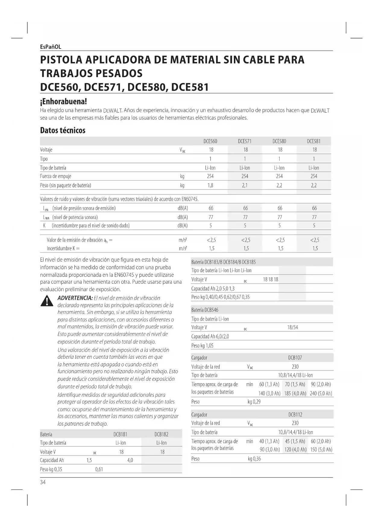 únicamente con los cargadores DeWALT indicados. Cargar los paquetes de baterías con baterías distintas a las indicadas por DeWALT en un cargador DeWALT , puede hacer que las baterías exploten o causar otras situacionespeligrosas. No queme el paquete debaterías. Uso: Uso sin tapa de transporte, la capacidad de Wh indica 108 Wh (1batería con 108 Wh). Transporte: Transporte con tapa de transporte incorporada, la capacidad de Wh indica 3 x 36 Wh (3 baterías de 36Wh). Tipo de baterÍa Los DCE560, DCE571, DCE580 y DCE581 funcionan con un paquete de baterías de 18 voltios. Estos paquetes de baterías pueden usarse: DCB181, DCB182, DCB183, DCB183B, DCB184, DCB184B, DCB185, DCB546. Consulte los Datos técnicos para másinformación. Contenido del embalaje El embalaje contiene: 1 Portacartucho (DCE560 y DCE581) 1 Porta saquito (DCE571, DCE580 y DCE581) 1 Pistola de cola 1 Vástago de émbolo corto (DCE581) 1 Paquete de baterías de ión-litio 1 Manual de instrucciones