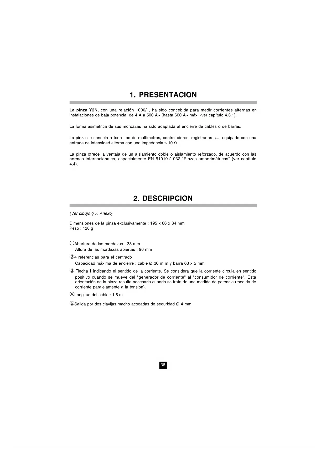 Dimensiones de la pinza exclusivamente : 195 x 66 x 34 mm Peso : 420 g ➀ Abertura de las mordazas : 33 mm Altura de las mordazas abiertas : 96 mm ➁ 4 referencias para el centrado Capacidad máxima de encierre : cable Ø 30 m m y barra 63 x 5 mm ➂ Flecha Ι indicando el sentido de la corriente. Se considera que la corriente circula en sentido positivo cuando se mueve del "generador de corriente" al "consumidor de corriente". Esta orientación de la pinza resulta necesaria cuando se trata de una medida de potencia (medida de corriente paralelamente a la tensión). ➃ Longitud del cable : 1,5 m ➄ Salida por dos clavijas macho acodadas de seguridad Ø 4 mm37