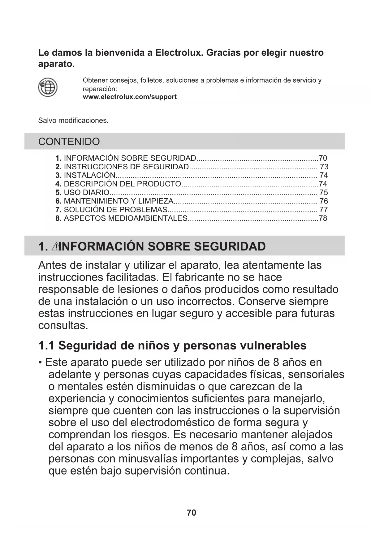 - Este aparato puede ser utilizado por niños de 8 años en adelante y personas cuyas capacidades físicas, sensoriales o mentales estén disminuidas o que carezcan de la experiencia y conocimientos suficientes para manejarlo, siempre que cuenten con las instrucciones o la supervisión sobre el uso del electrodoméstico de forma segura y comprendan los riesgos. Es necesario mantener alejados del aparato a los niños de menos de 8 años, así como a las personas con minusvalías importantes y complejas, salvo que estén bajo supervisión continua. 70• Es necesario vigilar a los niños para que no jueguen con el aparato.