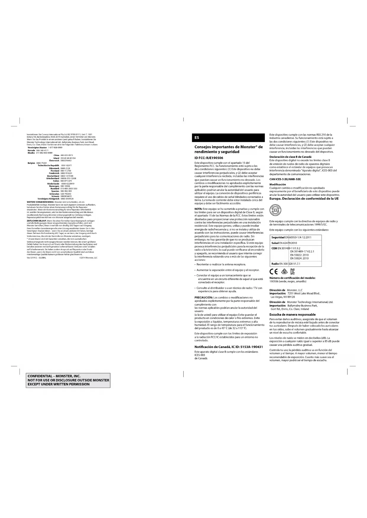 CÓMO HACER UNA RECLAMACIÓN. En caso de que aprecie un defecto del producto deberá seguir las instrucciones siguientes: (1) llame a Monster en los dos (2) meses posteriores al momento en que descubrió el defecto del producto (o al momento en el que debería haberlo descubierto si dicho defecto del producto fuese obvio); (2) proporcione una explicación detallada de cómo se produjo el daño; (3) obtenga un número de autorización de devolución; (4) devuelva el producto con los gastos de envío pagados por usted (le serán reembolsados si tiene derecho a reparación según el alcance de esta garantía limitada) a Monster para la verificación de los daños, junto con una copia del recibo original de venta o la prueba de compra (factura o albarán) de dicho producto, el formulario de reclamación cumplimentado y el número de autorización de devolución impreso en el exterior del paquete de devolución (el formulario de reclamación incluye las instrucciones de devolución). NÚMEROS DE TELÉFONO. Si compró el producto en los Estados Unidos (1-877-800-8989), América Latina (México 011-882-800-8989) o Asia-Pacíco (China 400-820-8973), contacte con Monster, LLC por correo postal en 455 Valley Drive, Brisbane, CA 94005 (TENGA EN CUENTA QUE MONSTER NO ACEPTA PRODUCTOS ENVIADOS A ESTA DIRECCIÓN. SIGA LAS INSTRUCCIONES SOBRE “CÓMO HACER UNA RECLAMACIÓN” ARRIBA DESCRITAS). Si compró el producto en Australia, contacte con el agente de Monster, Convoy International Pty Ltd (02 9700 0111), Unit 7, 1801 Botany Rd, Banksmeadow, NSW 2019 Australia. Si compró el producto en cualquier otro sitio, contacte con Monster Technology International Ltd., Ballymaley Business Park, Gort Road, Ennis, Co. Clare, Ireland. Puede utilizar uno de los siguientes números de teléfono: Estados Unidos 1-877-800-8989 Canadá 866-348-4171 México 011-882-800-8989 China 400-820-8973 Irlanda 353 65 68 69 354 Austria 0800296482 Bélgica 0800-79201 República Checa 800-142471 Dinamarca 8088-2128 Finlandia 800-112768 Francia 0800-918201 Alemania 0800-1819388 Grecia 00800-353-12008 Italia 800-871-479 Países Bajos 0800-0228919 Noruega 800-10906 Rusia 810-800-20051353 España 900-982-909 Suecia 020-792650 Suiza 0800834659 Reino Unido 0800-0569520 PROCEDIMIENTOS ADICIONALES. Monster determinará si el defecto del producto existía o no. Monster puede, a su criterio, indicarle que obtenga un presupuesto de la reparación en un centro de reparación. Si se solicita un presupuesto de reparación, se le indicará cómo enviar el presupuesto y la factura resultante a Monster para su pago. Todos los gastos de reparación debe negociarlos Monster. PLAZOS. Si presenta una reclamación formal de garantía que cumpla plenamente con todos los términos y condiciones de esta garantía limitada, Monster hará todo lo posible para ofrecerle una solución en un plazo de treinta (30) días tras la recepción de tu reclamación formal de garantía (si reside en los Estados Unidos, o de cuarenta y cinco (45) días si reside en cualquier otro sitio), a menos que circunstancias ajenas al control de Monster retrasen el proceso.