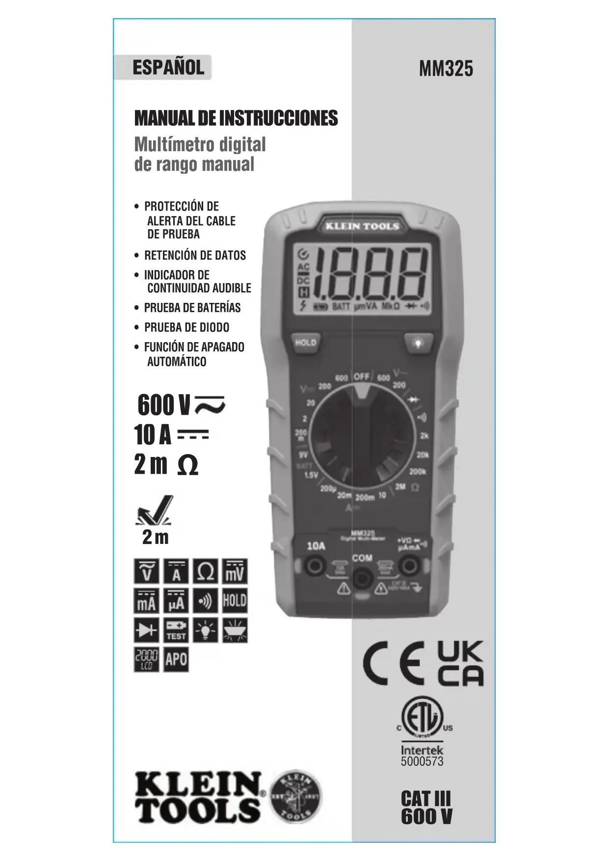 MM325 CAT III 600 V 2m14 ESPAÑOL ESPECIFICACIONES GENERALES El MM325 de Klein Tools es un multímetro de rango manual que mide voltaje CA/CD, corriente CD y resistencia. También sirve para probar baterías, diodos y continuidad.