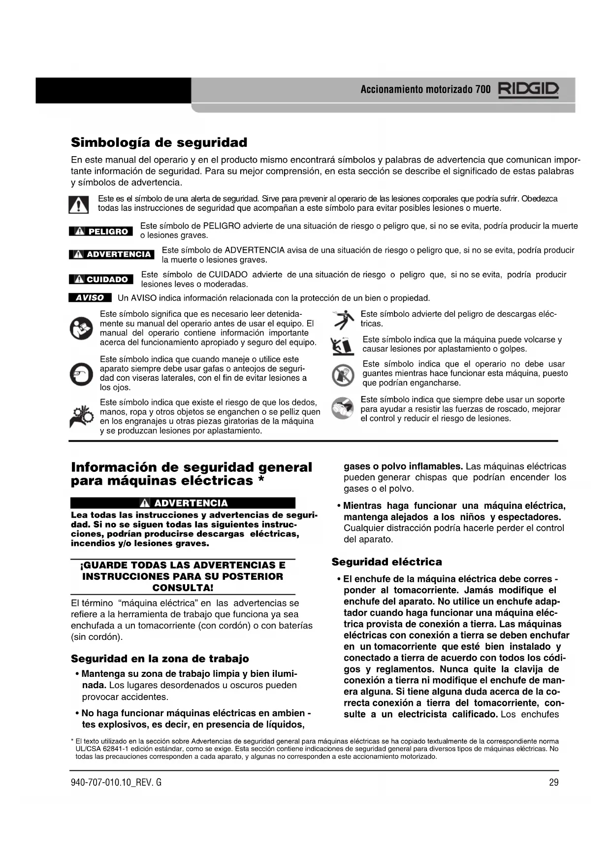 D• Si no dispone de un calibrador anular para veri- ficar el tamaño de la rosca, se puede usar en su lugar un acoplamiento limpio, nuevo y representativo de los que se están empleando en la obra. Para roscas NPT de 2 pulgadas o menos, el tubo debe labrarse para poder apretar la conexión con 4 a 5 vueltas a mano con el acoplamiento. Para roscas BSPT de 2 pulgadas o menos, la conexión se logra apretar con 3 vueltas a mano. Otros usos del accionamiento motorizado 700 Este manual contiene instrucciones específicas para el uso del accionamiento motorizado 700 para roscar con diversos cabezales roscadores de RIDGID. Cuando se usa con otros aparatos RIDGID (como el cortatubos eléctrico 258/258XL de RIDGID), siga las instrucciones y advertencias suministradas con ese aparato RIDGID, para su correcto montaje y uso. Si desea usar el accionamiento motorizado 700 para otros fines, cuidadosamente evalúe la tarea y prepárese a través de las pautas generales indicadas a conti - nuación. El accionamiento motorizado 700 proporciona un elevado par de torsión y genera las correspondientes elevadas fuerzas sobre el mango, que podrían causar lesiones por golpes o aplastamiento.
