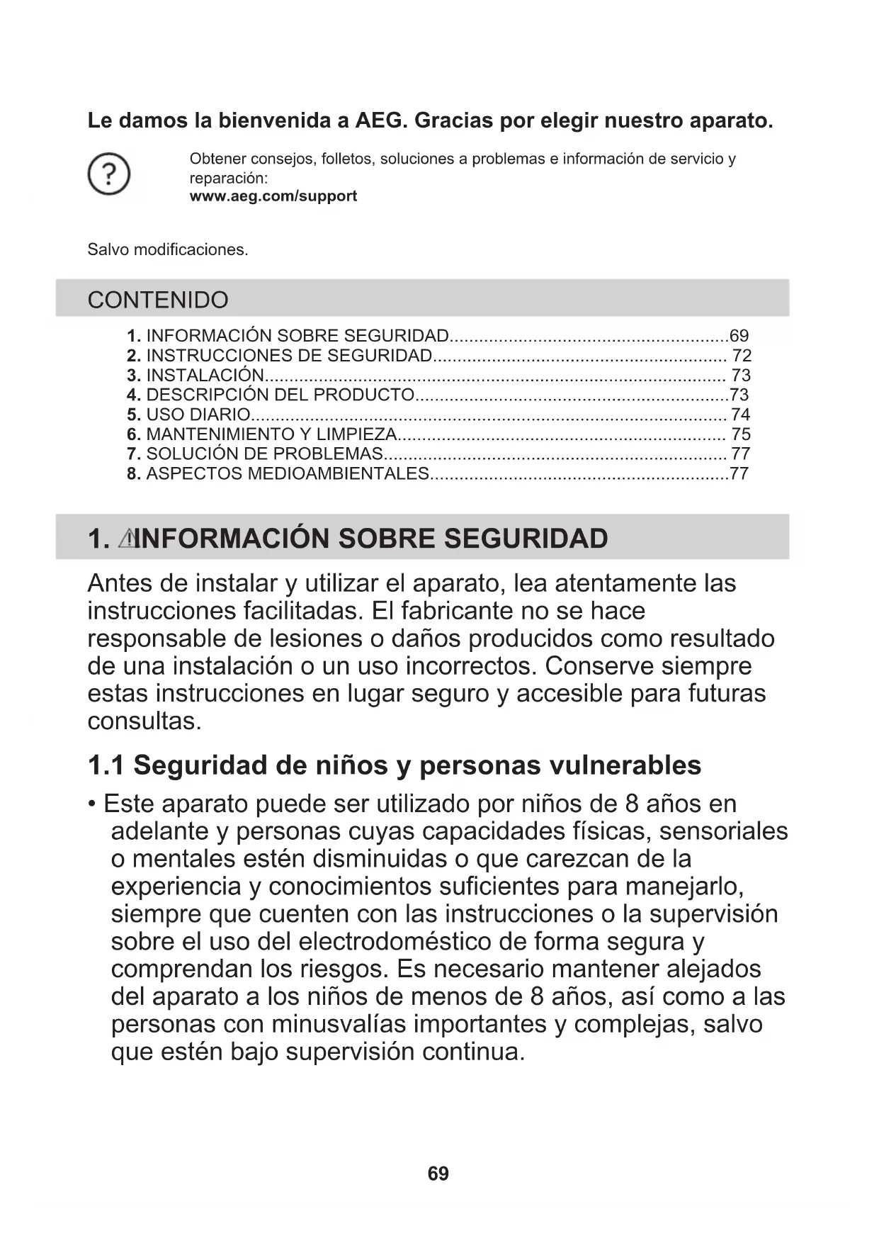 - Este aparato puede ser utilizado por niños de 8 años en adelante y personas cuyas capacidades físicas, sensoriales o mentales estén disminuidas o que carezcan de la experiencia y conocimientos suficientes para manejarlo, siempre que cuenten con las instrucciones o la supervisión sobre el uso del electrodoméstico de forma segura y comprendan los riesgos. Es necesario mantener alejados del aparato a los niños de menos de 8 años, así como a las personas con minusvalías importantes y complejas, salvo que estén bajo supervisión continua. 69• Es necesario vigilar a los niños para que no jueguen con el aparato.