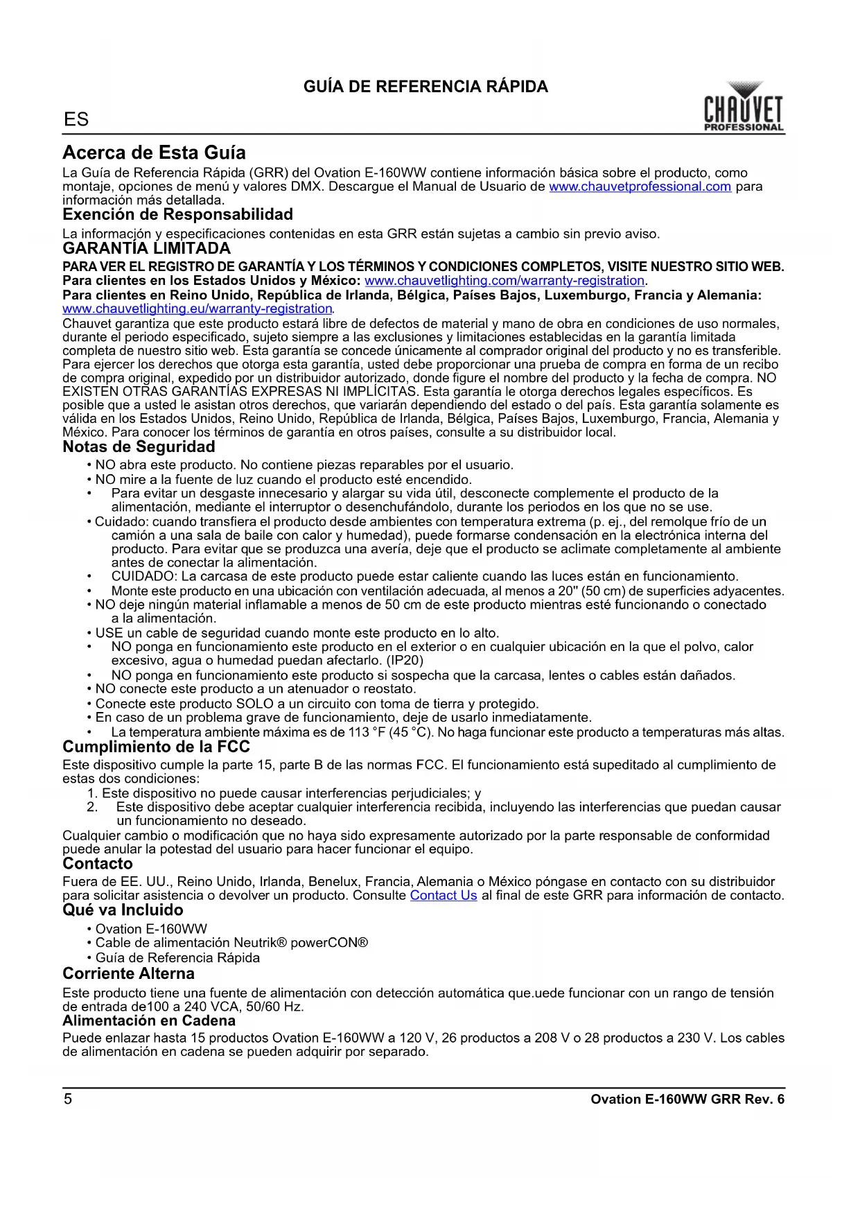 Chauvet garantiza que este producto estará libre de defectos de material y mano de obra en condiciones de uso normales, durante el periodo especificado, sujeto siempre a las exclusiones y limitaciones establecidas en la garantía limitada completa de nuestro sitio web. Esta garantía se concede únicamente al comprador original del producto y no es transferible. Para ejercer los derechos que otorga esta garantía, usted debe proporcionar una prueba de compra en forma de un recibo de compra original, expedido por un distribuidor autorizado, donde figure el nombre del producto y la fecha de compra. NO EXISTEN OTRAS GARANTÍAS EXPRESAS NI IMPLÍCITAS. Esta garantía le otorga derechos legales específicos. Es posible que a usted le asistan otros derechos, que variarán dependiendo del estado o del país. Esta garantía solamente es válida en los Estados Unidos, Reino Unido, República de Irlanda, Bélgica, Países Bajos, Luxemburgo, Francia, Alemania y México. Para conocer los términos de garantía en otros países, consulte a su distribuidor local. Notas de Seguridad