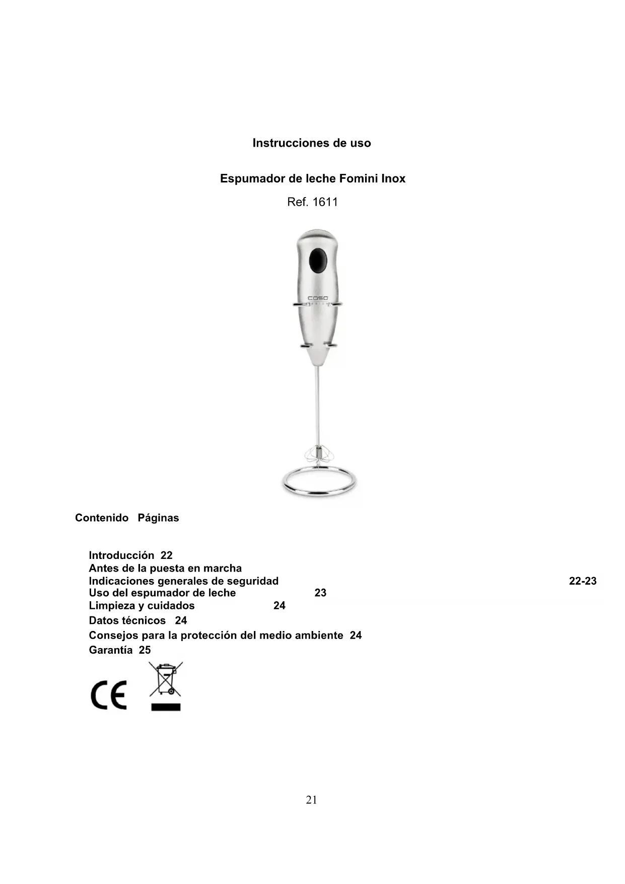 Contenido Páginas Introducción 22 Antes de la puesta en marcha 22 Indicaciones generales de seguridad 22-23 Uso del espumador de leche 23 Limpieza y cuidados 24 Datos técnicos 24 Consejos para la protección del medio ambiente 24 Garantía 2522