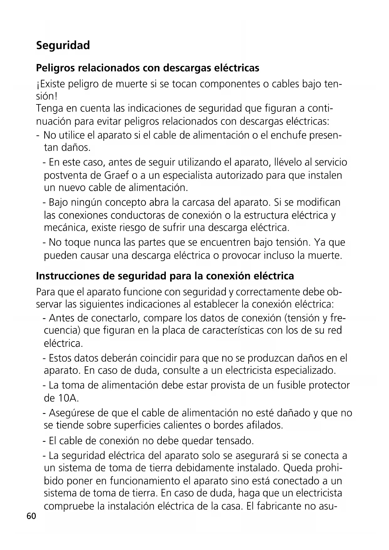 - Garantía Seguridad Peligros relacionados con descargas eléctricas ¡Existe peligro de muerte si se tocan componentes o cables bajo ten- sión! Tenga en cuenta las indicaciones de seguridad que guran a conti- nuación para evitar peligros relacionados con descargas eléctricas: - No utilice el aparato si el cable de alimentación o el enchufe presen- tan daños. - En este caso, antes de seguir utilizando el aparato, llévelo al servicio postventa de Graef o a un especialista autorizado para que instalen un nuevo cable de alimentación. - Bajo ningún concepto abra la carcasa del aparato. Si se modican las conexiones conductoras de conexión o la estructura eléctrica y mecánica, existe riesgo de sufrir una descarga eléctrica. - No toque nunca las partes que se encuentren bajo tensión. Ya que pueden causar una descarga eléctrica o provocar incluso la muerte. Instrucciones de seguridad para la conexión eléctrica Para que el aparato funcione con seguridad y correctamente debe ob- servar las siguientes indicaciones al establecer la conexión eléctrica: - Antes de conectarlo, compare los datos de conexión (tensión y fre- cuencia) que guran en la placa de características con los de su red eléctrica. - Estos datos deberán coincidir para que no se produzcan daños en el aparato. En caso de duda, consulte a un electricista especializado. - La toma de alimentación debe estar provista de un fusible protector de 10A. - Asegúrese de que el cable de alimentación no esté dañado y que no se tiende sobre supercies calientes o bordes alados. - El cable de conexión no debe quedar tensado. - La seguridad eléctrica del aparato solo se asegurará si se conecta a un sistema de toma de tierra debidamente instalado. Queda prohi- bido poner en funcionamiento el aparato sino está conectado a un sistema de toma de tierra. En caso de duda, haga que un electricista compruebe la instalación eléctrica de la casa. El fabricante no asu-61 p. 7060