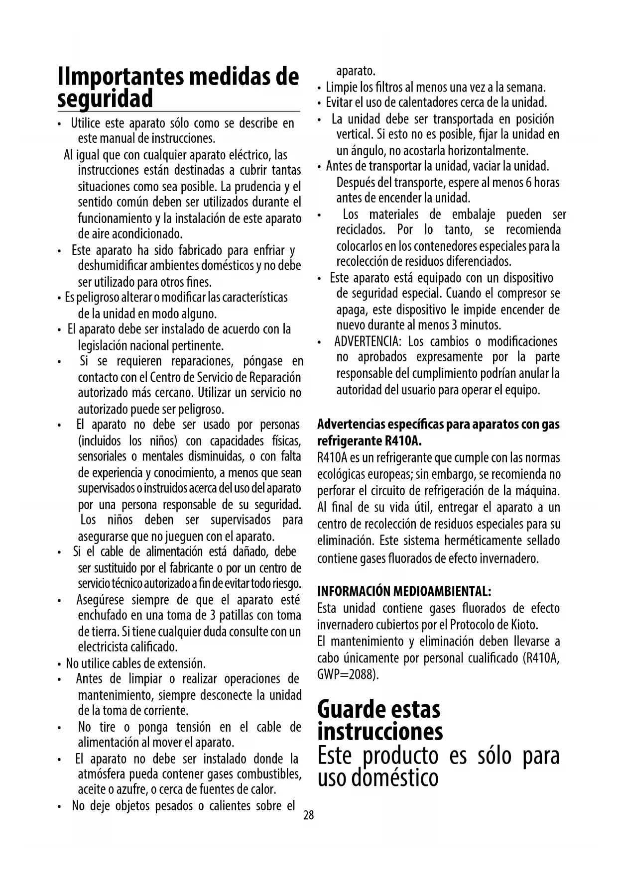 - Este aparato ha sido fabricado para enfriar y deshumidicar ambientes domésticos y no debe ser utilizado para otros nes.