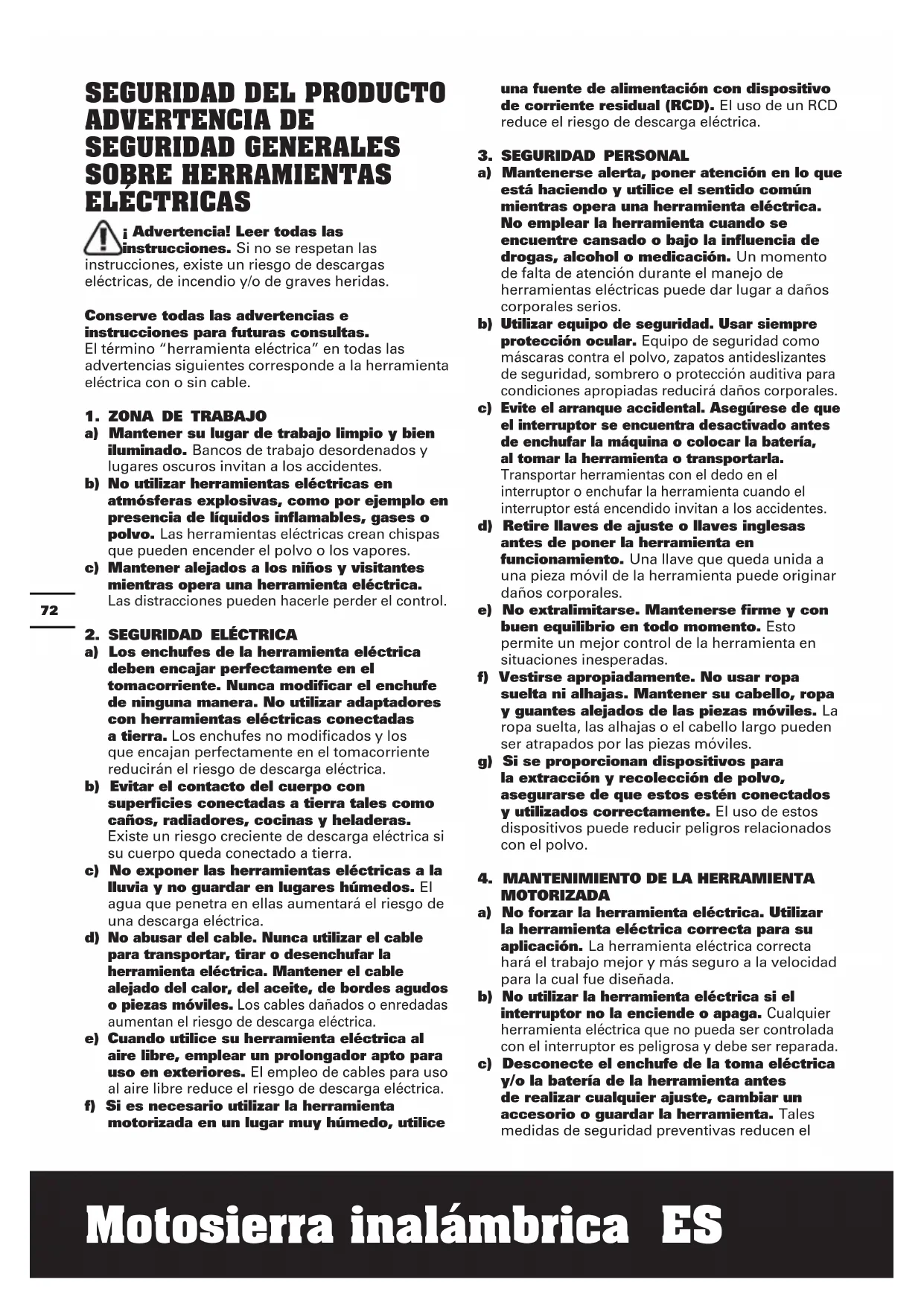 ADVERTENCIA DE SEGURIDAD GENERALES SOBRE HERRAMIENTAS ELÉCTRICAS ¡ Advertencia! Leer todas las instrucciones. Si no se respetan las instrucciones, existe un riesgo de descargas eléctricas, de incendio y/o de graves heridas. Conserve todas las advertencias e instrucciones para futuras consultas. El término “herramienta eléctrica” en todas las advertencias siguientes corresponde a la herramienta eléctrica con o sin cable.