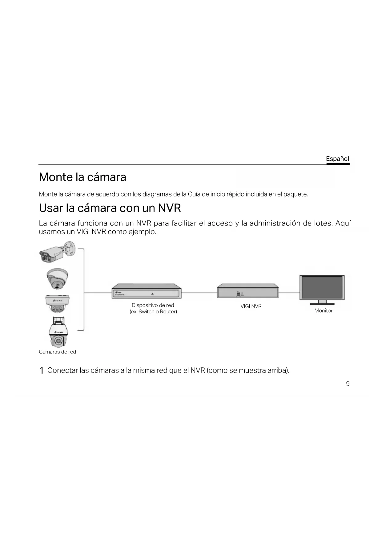 Conectar las cámaras a la misma red que el NVR (como se muestra arriba). Cámaras de red10 Español