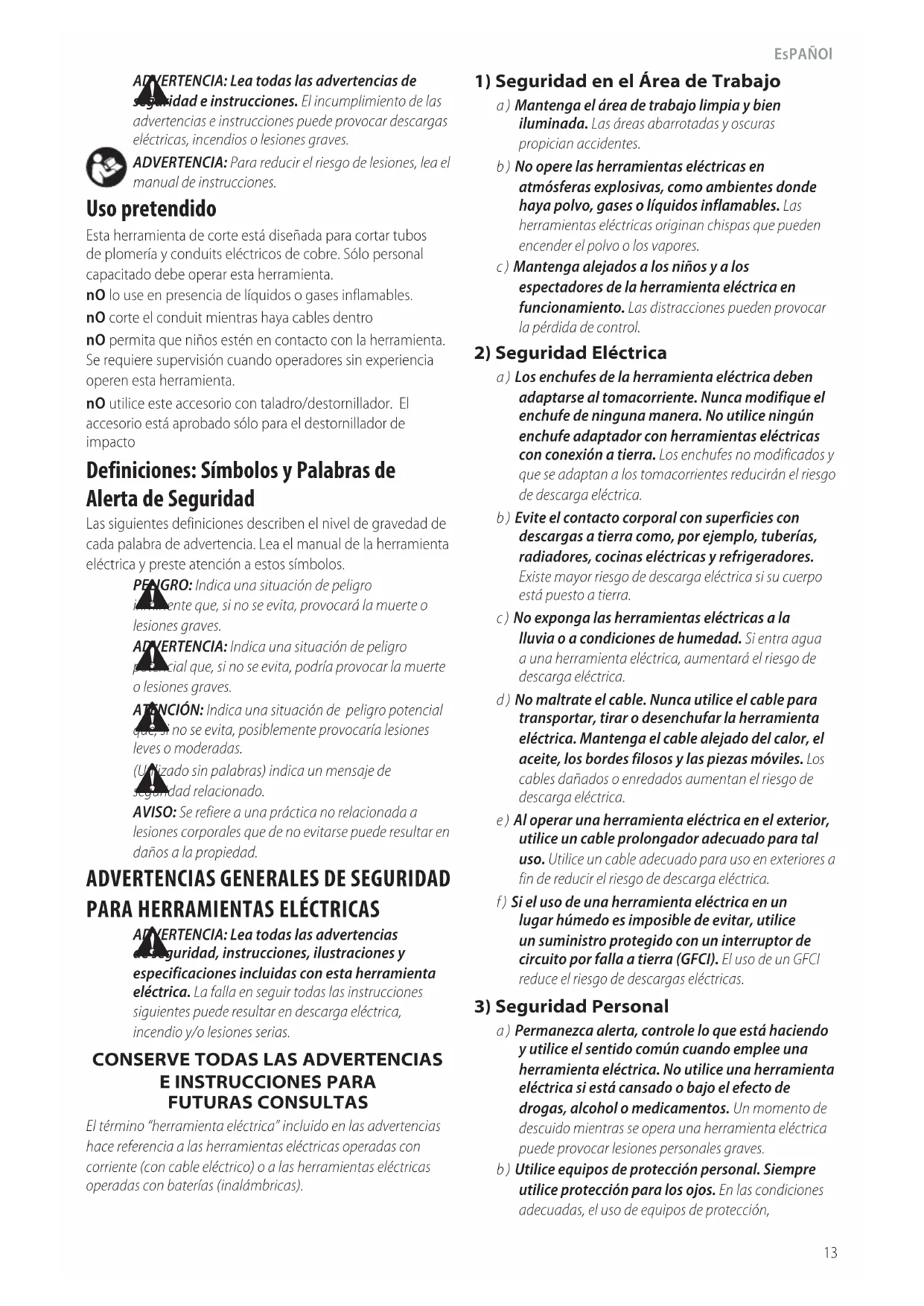 (Utilizado sin palabras) indica un mensaje de seguridadrelacionado. AVISO: Se refiere a una práctica no relacionada a lesiones corporales que de no evitarse puede resultar en daños a lapropiedad. Uso pretendido Esta herramienta de corte está diseñada para cortar tubos de plomería y conduits eléctricos de cobre. Sólo personal capacitado debe operar esta herramienta. nO lo use en presencia de líquidos o gases inflamables. nO corte el conduit mientras haya cables dentro nO permita que niños estén en contacto con la herramienta. Se requiere supervisión cuando operadores sin experiencia operen esta herramienta. nO utilice este accesorio con taladro/destornillador. El accesorio está aprobado sólo para el destornillador de impacto Español (traducido de las instrucciones originales)