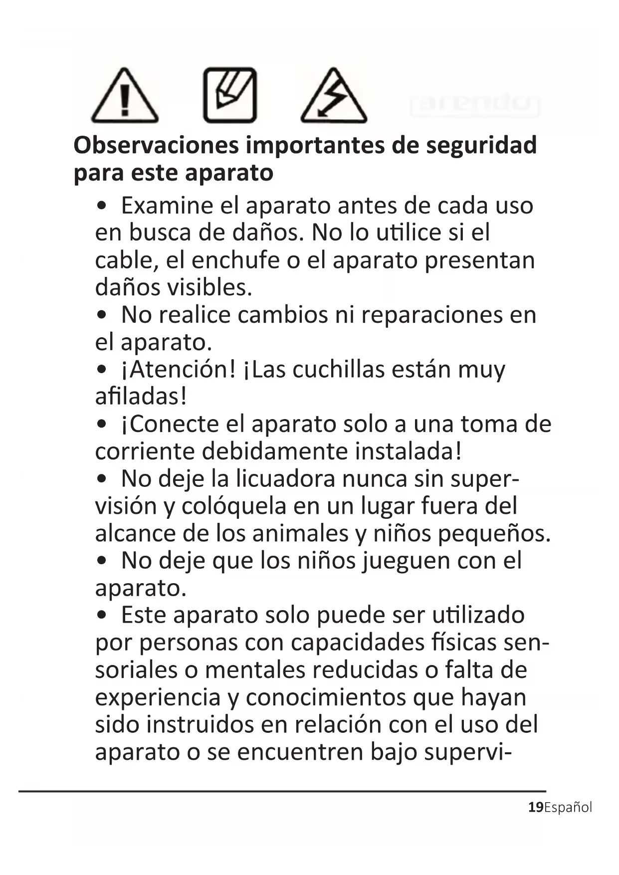 - Si el cable está dañado o presenta algún defecto, debe ser sustuido por el fabricante o por una persona cuali- cada para evitar daños.22 Español Gracias por escoger un producto de Arendo. Para que pueda disfrutar durante mucho empo de su adquisición, le rogamos que lea atentamente las siguientes instrucciones de uso. 1 Arculos suministrados