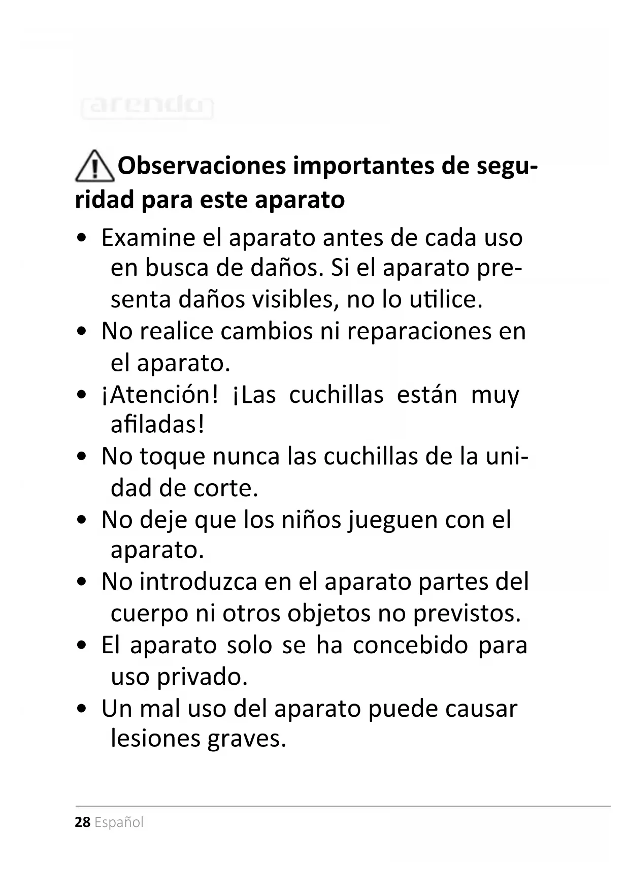 - El molinillo para especias es adecua- do para moler sal gruesa y granos e pimienta.30 Español Muchas gracias por escoger un producto de Arendo. Para que pueda disfrutar durante mucho empo de su adquisición, le rogamos que lea atentamente las siguientes instrucciones de uso. Antes de ponerlo en marcha, compruebe que el producto suministrado no presenta defectos ni daños.
