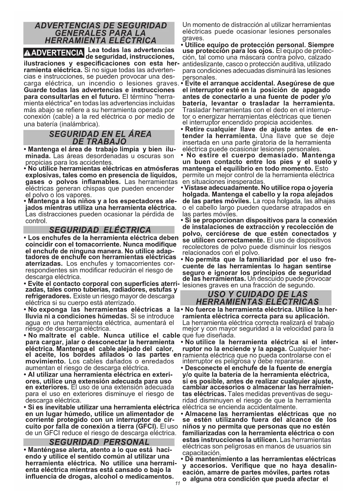 - Lleve su herramienta eléctrica a servicio con un técnico calicado que use únicamente piezas de reemplazo idénticas. Esto asegurará que la seguridad de la herramienta eléctrica se mantenga.