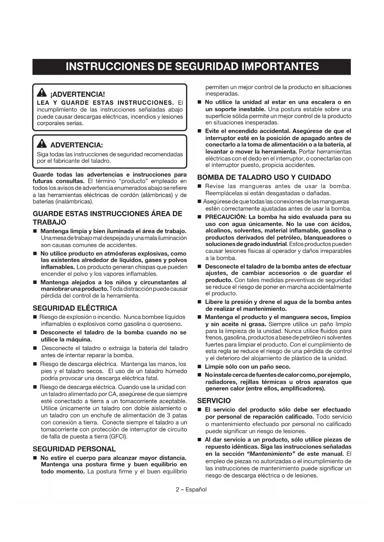 Revise las mangueras antes de usar la bomba. Reemplácelas si están desgastadas o dañadas. Asegúrese de que todas las conexiones de las mangueras estén correctamente ajustadas antes de usar la bomba. PRECAUCIÓN: La bomba ha sido evaluada para su uso con agua únicamente. No la use con ácidos, alcalinos, solventes, material inflamable, gasolina o productos derivados del petróleo, blanqueadores o soluciones de grado industrial. Estos productos pueden causar lesiones físicas al operador y daños irreparables a la bomba. Desconecte el taladro de la bomba antes de efectuar ajustes, de cambiar accesorios o de guardar el producto. Con tales medidas preventivas de seguridad se reduce el riesgo de poner en marcha accidentalmente el producto. Libere la presión y drene el agua de la bomba antes de realizar el mantenimiento. Mantenga el producto y el manguera secos, limpios y sin aceite ni grasa. Siempre utilice un paño limpio para la limpieza de la unidad. Nunca utilice fluidos para frenos, gasolina, productos a base de petróleo ni solventes fuertes para limpiar el producto. Con el cumplimiento de esta regla se reduce el riesgo de una pérdida de control y el deterioro del alojamiento de plástico de la unidad. Limpie sólo con un paño seco. No instale cerca de fuentes de calor como, por ejemplo, radiadores, rejillas térmicas u otros aparatos que generen calor (entre ellos, amplificadores). SERVICIO El servicio del producto sólo debe ser efectuado por personal de reparación calificado. Todo servicio o mantenimiento efectuado por personal no calificado puede significar un riesgo de lesiones. Al dar servicio a un producto, sólo utilice piezas de repuesto idénticas. Siga las instrucciones señaladas en la sección “Mantenimiento” de este manual. El empleo de piezas no autorizadas o el incumplimiento de las instrucciones de mantenimiento puede significar un riesgo de descarga eléctrica o de lesiones. INSTRUCCIONES DE SEGURIDAD IMPORTANTES3 – Español Familiarícese con su producto eléctrico. Lea cuidadosamente el manual del operador. Aprenda sus usos y limitaciones, así como los posibles peligros específicos de este producto. Con el cumplimiento de esta regla se reduce el riesgo de una descarga eléctrica, incendio o lesión seria. No permita que los niños usen la luz de trabajo. No es un juguete. No permita que la bomba funcione en seco. No levante la bomba tirando del cable o de las mangueras. Inspeccione la bomba y las mangueras. Asegúrese de que las mangueras estén libres de lodo, arena y suciedad. Desconecte la batería. Guarde estas instrucciones. Consúltelas con frecuencia y empléelas para instruir a otras personas que puedan utilizar esta herramienta. Si presta a alguien esta herramienta, facilítele también las instrucciones.