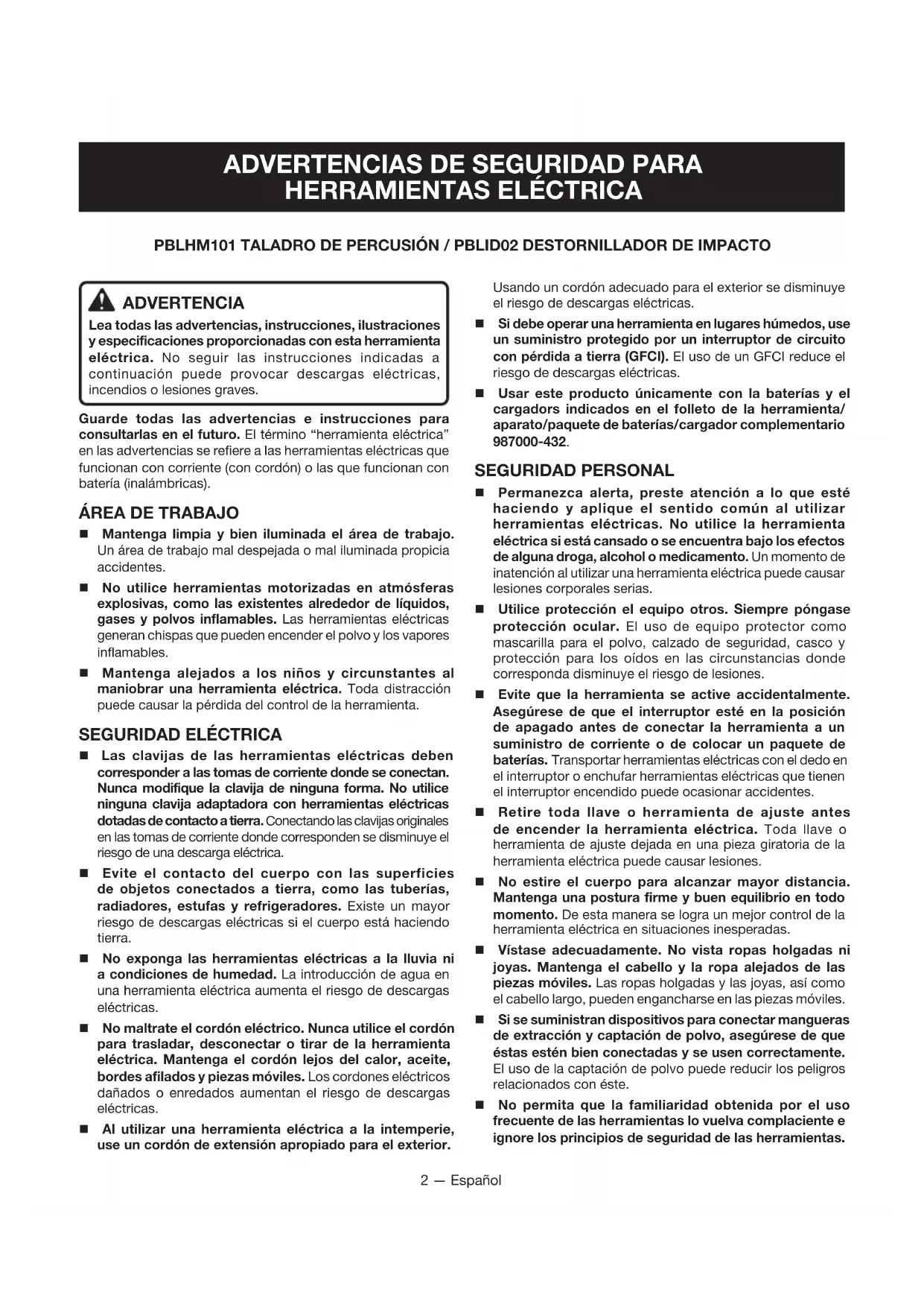Las clavijas de las herramientas eléctricas deben corresponder a las tomas de corriente donde se conectan. Nunca modifique la clavija de ninguna forma. No utilice ninguna clavija adaptadora con herramientas eléctricas dotadas de contacto a tierra. Conectando las clavijas originales en las tomas de corriente donde corresponden se disminuye el riesgo de una descarga eléctrica. Evite el contacto del cuerpo con las superficies de objetos conectados a tierra, como las tuberías, radiadores, estufas y refrigeradores. Existe un mayor riesgo de descargas eléctricas si el cuerpo está haciendo tierra. No exponga las herramientas eléctricas a la lluvia ni a condiciones de humedad. La introducción de agua en una herramienta eléctrica aumenta el riesgo de descargas eléctricas. No maltrate el cordón eléctrico. Nunca utilice el cordón para trasladar, desconectar o tirar de la herramienta eléctrica. Mantenga el cordón lejos del calor, aceite, bordes afilados y piezas móviles. Los cordones eléctricos dañados o enredados aumentan el riesgo de descargas eléctricas. Al utilizar una herramienta eléctrica a la intemperie, use un cordón de extensión apropiado para el exterior. Usando un cordón adecuado para el exterior se disminuye el riesgo de descargas eléctricas. Si debe operar una herramienta en lugares húmedos, use un suministro protegido por un interruptor de circuito con pérdida a tierra (GFCI). El uso de un GFCI reduce el riesgo de descargas eléctricas. Usar este producto únicamente con la baterías y el cargadors indicados en el folleto de la herramienta/ aparato/paquete de baterías/cargador complementario 987000-432. SEGURIDAD PERSONAL Permanezca alerta, preste atención a lo que esté haciendo y aplique el sentido común al utilizar herramientas eléctricas. No utilice la herramienta eléctrica si está cansado o se encuentra bajo los efectos de alguna droga, alcohol o medicamento. Un momento de inatención al utilizar una herramienta eléctrica puede causar lesiones corporales serias. Utilice protección el equipo otros. Siempre póngase protección ocular. El uso de equipo protector como mascarilla para el polvo, calzado de seguridad, casco y protección para los oídos en las circunstancias donde corresponda disminuye el riesgo de lesiones. Evite que la herramienta se active accidentalmente. Asegúrese de que el interruptor esté en la posición de apagado antes de conectar la herramienta a un suministro de corriente o de colocar un paquete de baterías. Transportar herramientas eléctricas con el dedo en el interruptor o enchufar herramientas eléctricas que tienen el interruptor encendido puede ocasionar accidentes. Retire toda llave o herramienta de ajuste antes de encender la herramienta eléctrica. Toda llave o herramienta de ajuste dejada en una pieza giratoria de la herramienta eléctrica puede causar lesiones. No estire el cuerpo para alcanzar mayor distancia. Mantenga una postura firme y buen equilibrio en todo momento. De esta manera se logra un mejor control de la herramienta eléctrica en situaciones inesperadas. Vístase adecuadamente. No vista ropas holgadas ni joyas. Mantenga el cabello y la ropa alejados de las piezas móviles. Las ropas holgadas y las joyas, así como el cabello largo, pueden engancharse en las piezas móviles. Si se suministran dispositivos para conectar mangueras de extracción y captación de polvo, asegúrese de que éstas estén bien conectadas y se usen correctamente. El uso de la captación de polvo puede reducir los peligros relacionados con éste. No permita que la familiaridad obtenida por el uso frecuente de las herramientas lo vuelva complaciente e ignore los principios de seguridad de las herramientas. PBLHM101 TALADRO DE PERCUSIÓN / PBLID02 DESTORNILLADOR DE IMPACTO