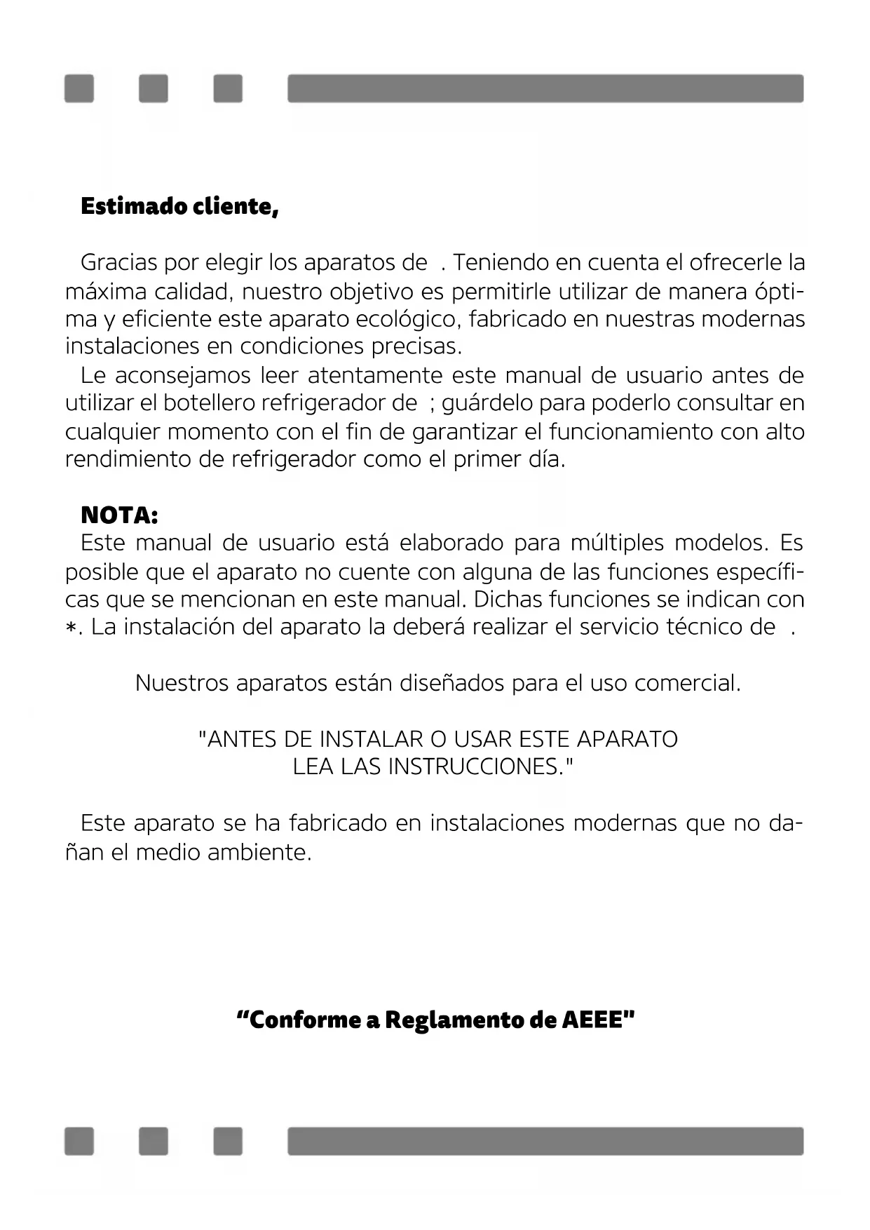 Modelos ORC 3901 P28 Estimado cliente, Gracias por elegir los aparatos de . Teniendo en cuenta el ofrecerle la máxima calidad, nuestro objetivo es permitirle utilizar de manera ópti- ma y eciente este aparato ecológico, fabricado en nuestras modernas instalaciones en condiciones precisas. Le aconsejamos leer atentamente este manual de usuario antes de utilizar el botellero refrigerador de ; guárdelo para poderlo consultar en cualquier momento con el n de garantizar el funcionamiento con alto rendimiento de refrigerador como el primer día. NOTA: Este manual de usuario está elaborado para múltiples modelos. Es posible que el aparato no cuente con alguna de las funciones especí- cas que se mencionan en este manual. Dichas funciones se indican con *. La instalación del aparato la deberá realizar el servicio técnico de . Nuestros aparatos están diseñados para el uso comercial. "ANTES DE INSTALAR O USAR ESTE APARATO