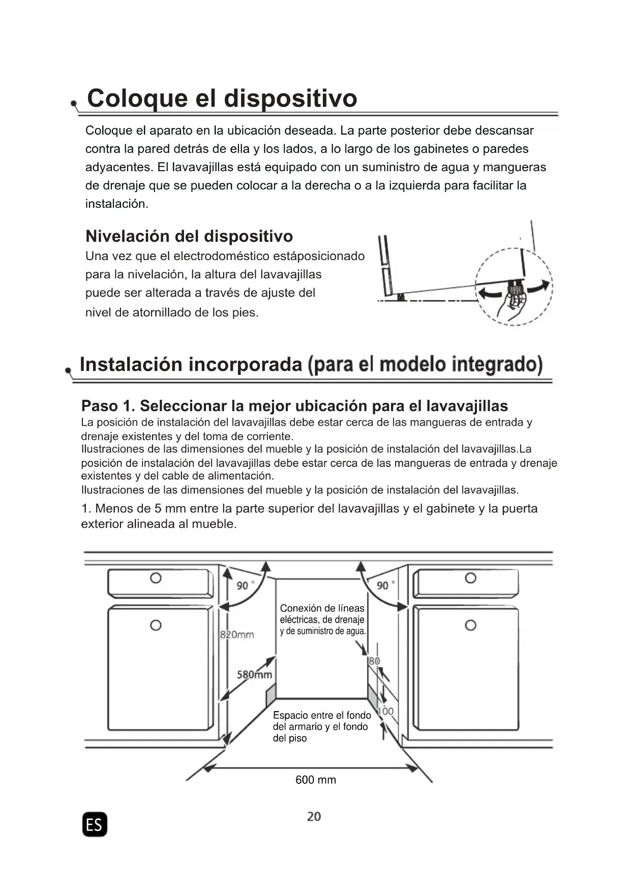 erior Brazo pulverizador inferiorConjunto de filtradoDepósito de sal Dispensador Bandeja para cubiertos Brazo pulverizador superior Cesta inferior Tubo interior Bandeja para tazas Cesta superiorESESESESESESESESESESESES Coloque el dispositivo Coloque el aparato en la ubicación deseada. La parte posterior debe descansar contra la pared detrás de ella y los lados, a lo largo de los gabinetes o paredes adyacentes. El lavavajillas está equipado con un suministro de agua y mangueras de drenaje que se pueden colocar a la derecha o a la izquierda para facilitar la instalación. Nivelación del dispositivo Una vez que el electrodoméstico estáposicionadopara la nivelación, la altura del lavavajillaspuede ser alterada a través de ajuste delnivel de atornillado de los pies. Instalación incorporada Paso 1. Seleccionar la mejor ubicación para el lavavajillasLa posición de instalación del lavavajillas debe estar cerca de las mangueras de entrada y drenaje existentes y del toma de corriente.Ilustraciones de las dimensiones del mueble y la posición de instalación del lavavajillas.La posición de instalación del lavavajillas debe estar cerca de las mangueras de entrada y drenaje existentes y del cable de alimentación.Ilustraciones de las dimensiones del mueble y la posición de instalación del lavavajillas.1. Menos de 5 mm entre la parte superior del lavavajillas y el gabinete y la puerta exterior alineada al mueble.Conexión de líneaseléctricas, de drenajey de suministro de agua.Espacio entre el fondodel armario y el fondodel piso600 mmES Paso 2. Dimensiones e instalación del panel estético 2. Si el lavavajillas está atascado en la esquina del gabinete, debe haber algo de espacio cuando se abra la puertaGabineteLavavajillasPuerta dellavavajillasEspacio mínimo 50mm NOTA: Dependiendo de dónde se encuentre su tomaun agujero en el lado opuesto del armario.El panel de madera estético podría procesarse de acuerdo con los planos de instalación.de corriente, es posible que tenga que hacer