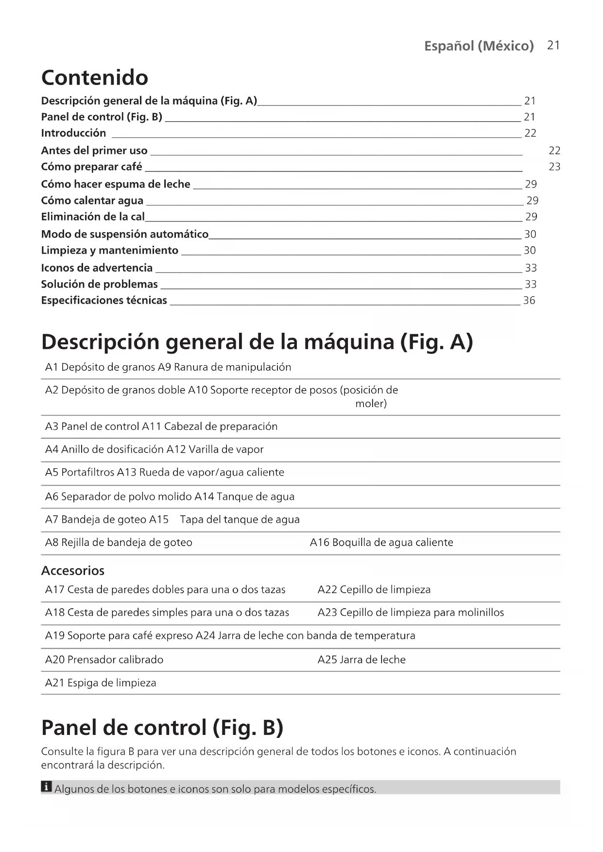 Español (México) Contenido Descripción general de la máquina (Fig. A)_________________________________________________ 21 Panel de control (Fig. B) __________________________________________________________________ 21 Introducción ____________________________________________________________________________ 22 Antes del primer uso _____________________________________________________________________ 22 Cómo preparar café ______________________________________________________________________ 23 Cómo hacer espuma de leche _____________________________________________________________ 29 Cómo calentar agua ______________________________________________________________________ 29 Eliminación de la cal______________________________________________________________________ 29 Modo de suspensión automático__________________________________________________________ 30 Limpieza y mantenimiento _______________________________________________________________ 30 Iconos de advertencia ____________________________________________________________________ 33 Solución de problemas ___________________________________________________________________ 33 Especificaciones técnicas _________________________________________________________________ 36 Descripción general de la máquina (Fig. A) A1 Depósito de granos A9 Ranura de manipulación A2 Depósito de granos doble A10 Soporte receptor de posos (posición de moler) A3 Panel de control A11 Cabezal de preparación A4 Anillo de dosificación A12 Varilla de vapor A5 Portafiltros A13 Rueda de vapor/agua caliente A6 Separador de polvo molido A14 Tanque de agua A7 Bandeja de goteo A15 Tapa del tanque de agua A8 Rejilla de bandeja de goteo A16 Boquilla de agua caliente Accesorios A17 Cesta de paredes dobles para una o dos tazas A22 Cepillo de limpieza A18 Cesta de paredes simples para una o dos tazas A23 Cepillo de limpieza para molinillos A19 Soporte para café expreso A24 Jarra de leche con banda de temperatura A20 Prensador calibrado A25 Jarra de leche A21 Espiga de limpieza Panel de control (Fig. B) Consulte la figura B para ver una descripción general de todos los botones e iconos. A continuación encontrará la descripción. Algunos de los botones e iconos son solo para modelos específicos.22 Español (México) B1 Encendido/apagado B6 Indicador de presión B2 Luz de descalcificación B7 Espresso B3 Molinillo B8 Espresso doble B4 Luces de dosis simple/doble B9 Americano B5 Rueda de cantidad de molienda B10 Luz de agua caliente/vapor Introducción ¡Felicidades por la adquisición de una cafetera Philips Barista Brew Espresso! Para sacar el mayor partido a la asistencia que ofrecemos, registre el producto en www.philips.com/welcome. Lea atentamente el folleto de seguridad adjunto antes de usar la máquina por primera vez y consérvelo por si necesitara consultarlo en el futuro. Para ayudarlo a empezar y sacarle el máximo provecho a la cafetera, le ofrecemos ayuda en línea a través de www.philips.com/coffee-care. Hay varias versiones de esta cafetera expreso semiautomática, todas ellas con funciones distintas. Cada versión tiene un número de tipo. Puede encontrar el número de tipo en la etiqueta de datos que se encuentra en la parte inferior de la cafetera. Este aparato se ha probado con café. Aunque se limpió cuidadosamente, pueden haber quedado algunos residuos. Sin embargo, le garantizamos que la máquina es absolutamente nueva. Antes del primer uso