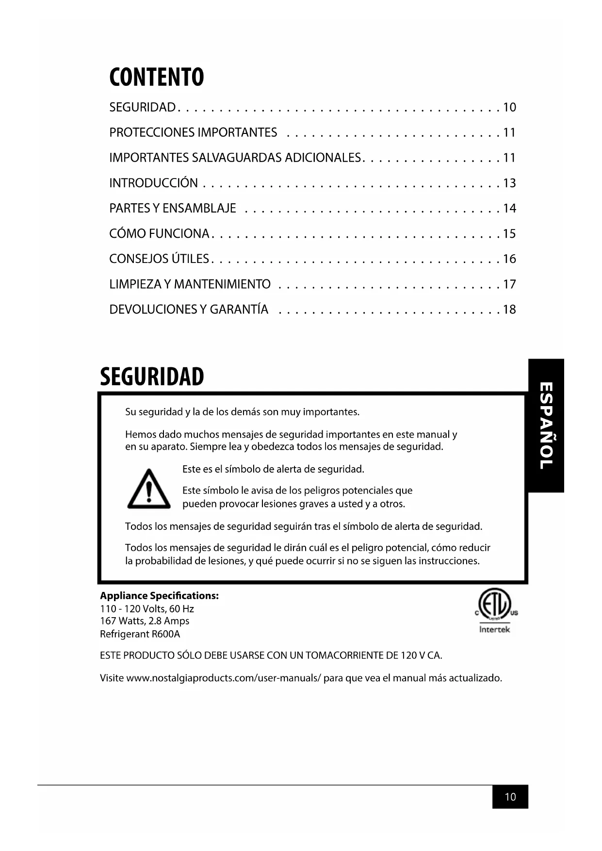 167 Watts, 2.8 Amps Refrigerant R600A ESTE PRODUCTO SÓLO DEBE USARSE CON UN TOMACORRIENTE DE 120 V CA. Visite www.nostalgiaproducts.com/user-manuals/ para que vea el manual más actualizado. Su seguridad y la de los demás son muy importantes. Hemos dado muchos mensajes de seguridad importantes en este manual y en su aparato. Siempre lea y obedezca todos los mensajes de seguridad. Este es el símbolo de alerta de seguridad. Este símbolo le avisa de los peligros potenciales que pueden provocar lesiones graves a usted y a otros. Todos los mensajes de seguridad seguirán tras el símbolo de alerta de seguridad. Todos los mensajes de seguridad le dirán cuál es el peligro potencial, cómo reducir la probabilidad de lesiones, y qué puede ocurrir si no se siguen las instrucciones.11 ESPAÑOL
