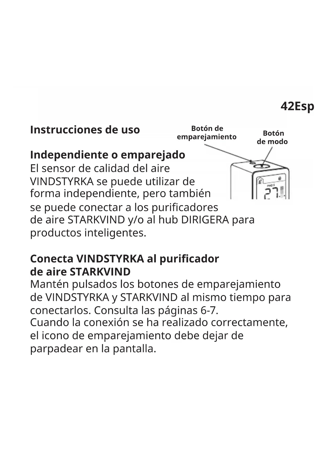 - Contacter votre revendeur ou tout technicien radio/TV qualié pour obtenir de l’aide.41 Le pictogramme de la poubelle barrée indique que le produit doit faire l'objet d'un tri. Il doit être recyclé conformément à la réglementation environnementale locale en matière de déchets. En triant les produits portant ce pictogramme, vous contribuez à réduire le volume des déchets incinérés ou enfouis, et à diminuer tout impact négatif sur la santé humaine et l'environnement. Pour plus d'information, merci de contacter votre magasin IKEA.42Español Instrucciones de uso Independiente o emparejado El sensor de calidad del aire VINDSTYRKA se puede utilizar de forma independiente, pero también se puede conectar a los puricadores de aire STARKVIND y/o al hub DIRIGERA para productos inteligentes. Conecta VINDSTYRKA al puricador de aire STARKVIND Mantén pulsados los botones de emparejamiento de VINDSTYRKA y STARKVIND al mismo tiempo para conectarlos. Consulta las páginas 6-7. Cuando la conexión se ha realizado correctamente, el icono de emparejamiento debe dejar de parpadear en la pantalla. Botón de emparejamiento Botón de modo43 Fuente de alimentación recomendada: 5,0 VCC, 1,0 A (no incluida) Conecta VINDSTYRKA al hub DIRIGERA Al conectar VINDSTYRKA al hub DIRIGERA, podrás ver la calidad del aire de la habitación en la aplicación inteligente IKEA Home. Si tienes un dispositivo iOS: Accede a la App Store y descárgate la aplicación inteligente IKEA Home. La aplicación te enseñará cómo conectar VINDSTYRKA al hub DIRIGERA. Si tienes un dispositivo Android: Accede a Google Play y descárgate la aplicación inteligente IKEA Home. La aplicación te enseñará cómo conectar VINDSTYRKA al hub DIRIGERA.44 Emparejamiento: Conexión del sensor de calidad del aire VINDSTYRKA al hub DIRIGERA y al puricador de aire STARKVIND.