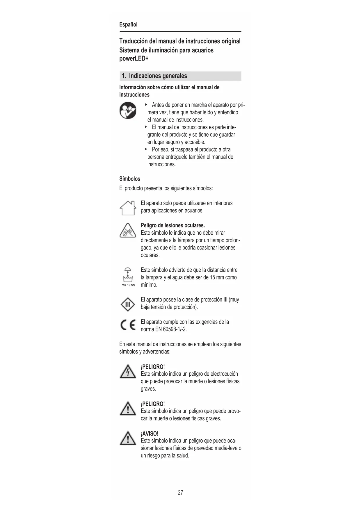 Información sobre cómo utilizar el manual de instrucciones ▶ Antes de poner en marcha el aparato por pri- mera vez, tiene que haber leído y entendido el manual de instrucciones. ▶ El manual de instrucciones es parte inte- grante del producto y se tiene que guardar en lugar seguro y accesible. ▶ Por eso, si traspasa el producto a otra persona entréguele también el manual de instrucciones. Símbolos El producto presenta los siguientes símbolos: El aparato solo puede utilizarse en interiores para aplicaciones en acuarios. Peligro de lesiones oculares. Este símbolo le indica que no debe mirar directamente a la lámpara por un tiempo prolon- gado, ya que ello le podría ocasionar lesiones oculares. Este símbolo advierte de que la distancia entre la lámpara y el agua debe ser de 15 mm como mínimo. El aparato posee la clase de protección III (muy baja tensión de protección). El aparato cumple con las exigencias de la norma EN 60598-1/-2. En este manual de instrucciones se emplean los siguientes símbolos y advertencias: ¡PELIGRO! Este símbolo indica un peligro de electrocución que puede provocar la muerte o lesiones físicas graves. ¡PELIGRO! Este símbolo indica un peligro que puede provo- car la muerte o lesiones físicas graves. ¡AVISO! Este símbolo indica un peligro que puede oca- sionar lesiones físicas de gravedad media-leve o un riesgo para la salud. min. 15 mmEspañol