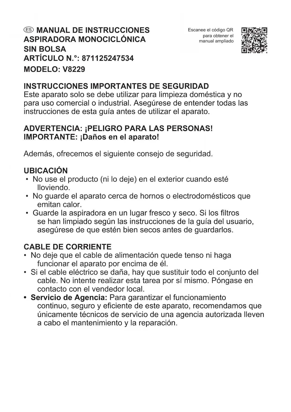 Este aparato solo se debe utilizar para limpieza doméstica y no para uso comercial o industrial. Asegúrese de entender todas las instrucciones de esta guía antes de utilizar el aparato. ADVERTENCIA: ¡PELIGRO PARA LAS PERSONAS! IMPORTANTE: ¡Daños en el aparato! Además, ofrecemos el siguiente consejo de seguridad. UBICACIÓN