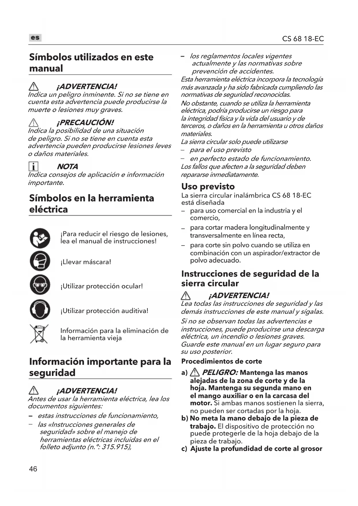 PELIGRO: Mantenga las manos alejadas de la zona de corte y de la hoja. Mantenga su segunda mano en el mango auxiliar o en la carcasa del motor. Si ambas manos sostienen la sierra, no pueden ser cortadas por la hoja.b) No meta la mano debajo de la pieza de trabajo. El dispositivo de protección no puede protegerle de la hoja debajo de la pieza de trabajo.c) Ajuste la profundidad de corte al grosor47 CS 68 18-EC de la pieza de trabajo. Debe verse menos de un diente completo de los dientes de la hoja por debajo de la pieza de trabajo. d) No sujete nunca la pieza de trabajo en las manos ni sobre la pierna mientras corta. Sujete la pieza de trabajo a una plataforma estable. Es importante apoyar el trabajo adecuadamente para minimizar la exposición del cuerpo, el atascamiento de la hoja o la pérdida de control. e) Sujete la herramienta eléctrica por las superficies de agarre aisladas en aquellos trabajos en los que el elemento de corte o las piezas de sujeción puedan entrar en contacto con cables ocultos o con el cable del propio aparato. El contacto con un cable bajo tensión podría hacer que las piezas metálicas expuestas de la herramienta eléctrica transmitan tensión y provoquen una descarga eléctrica al usuario. f) Al copiar, utilice siempre un tope paralelo o una guía de borde recto. Esto mejora la precisión del corte y reduce la posibilidad de que la hoja se atasque. g) Utilice siempre hojas del tamaño correcto y con la forma adecuada (rombo o redonda) del agujero. Las hojas que no coincidan con el equipo de montaje de la sierra funcionarán descentradas y provocarán una pérdida de control. h) Nunca use arandelas o pernos de hoja dañados o incorrectos. Las arandelas y el perno de la hoja han sido diseñados especialmente para su sierra, para lograr un rendimiento óptimo y un funcionamiento seguro. Causas de retroceso y otras advertencias relacionadas